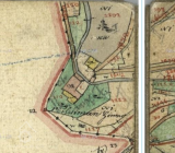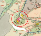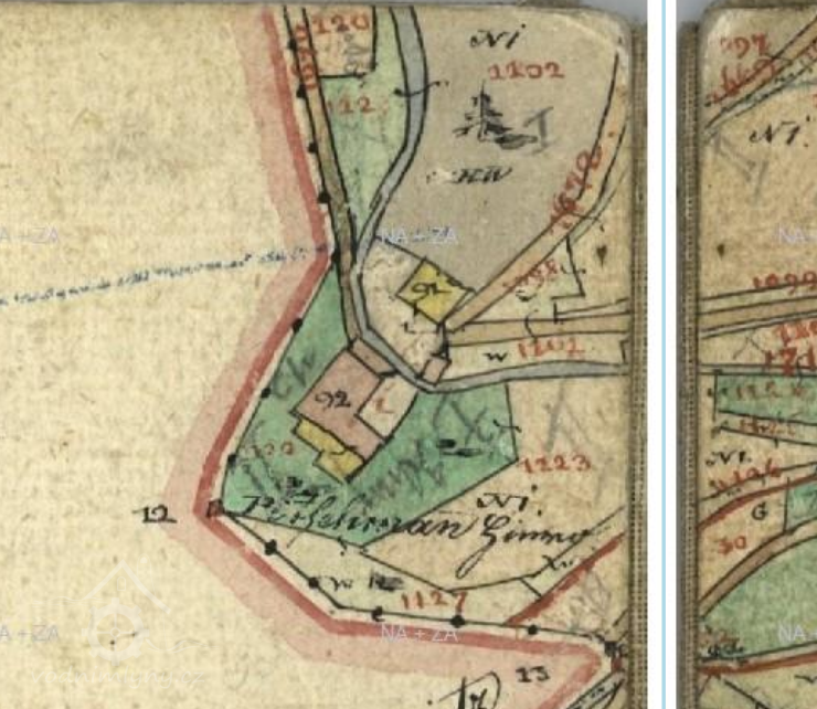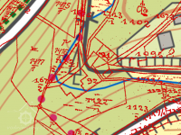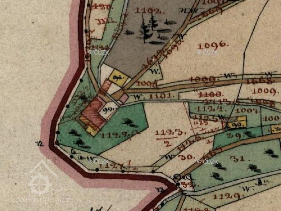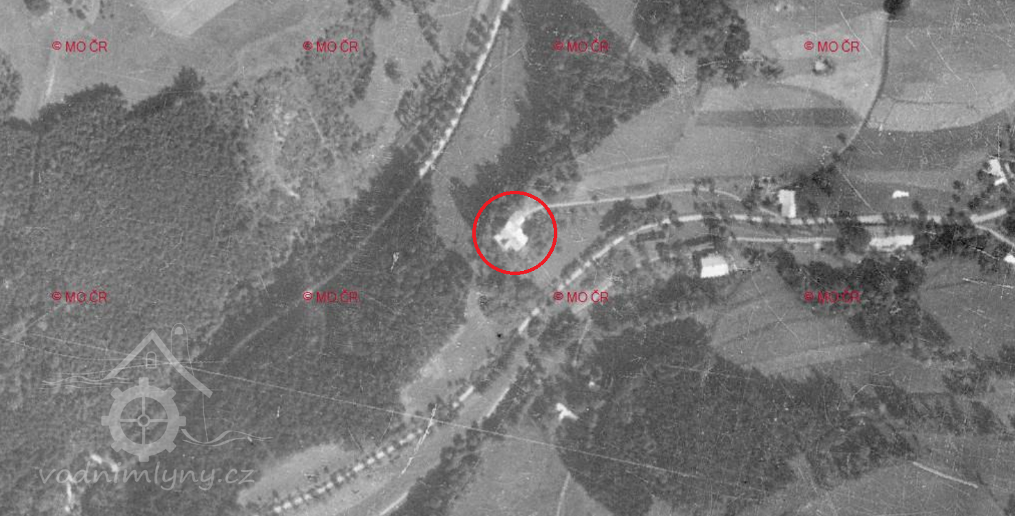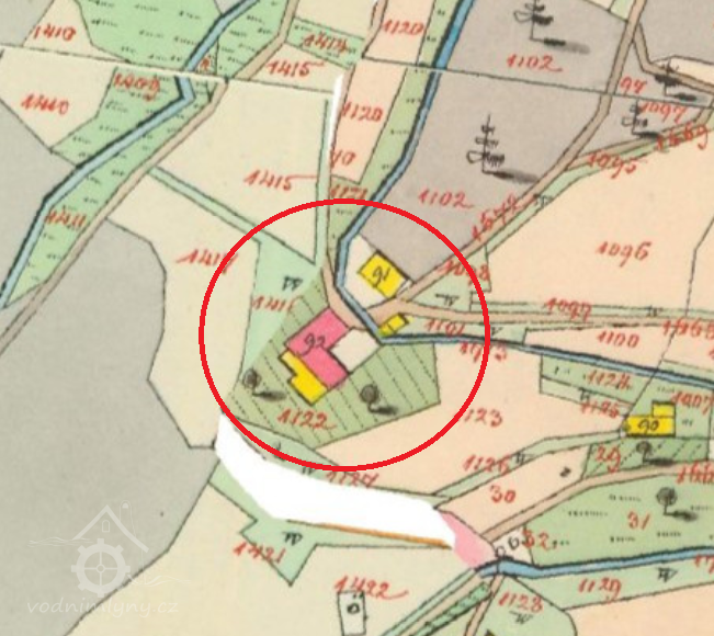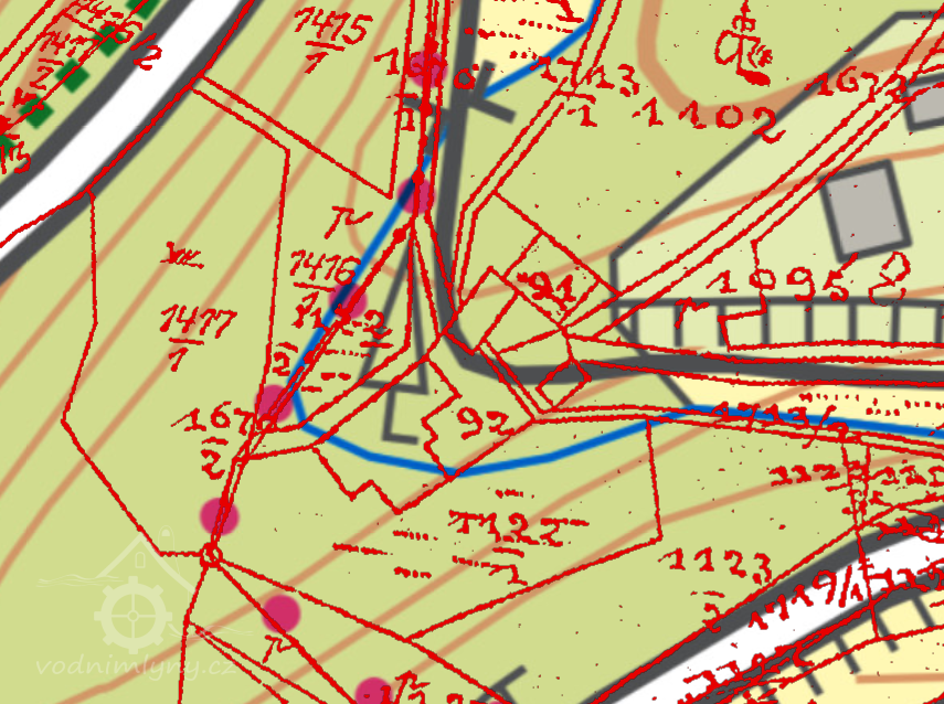 Zaniklý mlýn na dlouhém náhonu, neobvykle položený vysoko ve svahu.