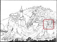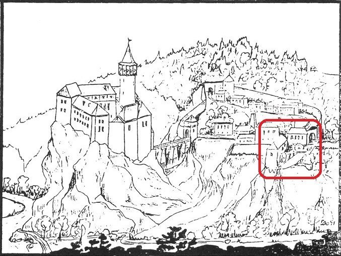 1674 na nejstarším vyobrazení hradu patrný pouze nový mlýnec, situovaný vedle baštovitého výstupku