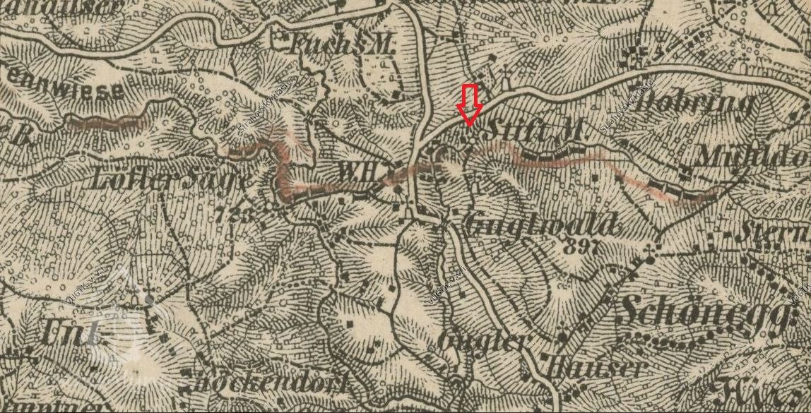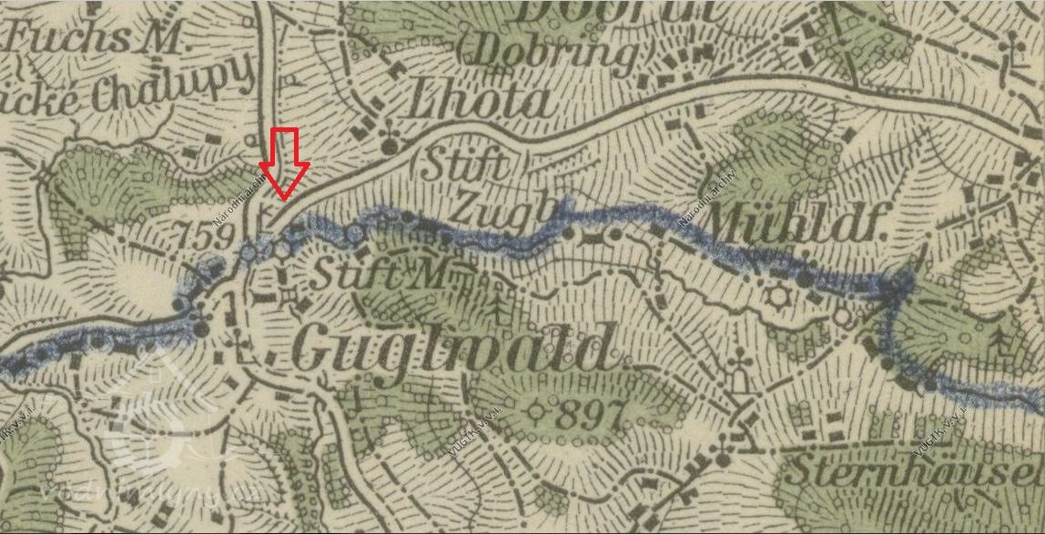 Mlýn s pilou starého založení, zbořený při budování hraničního pásma.