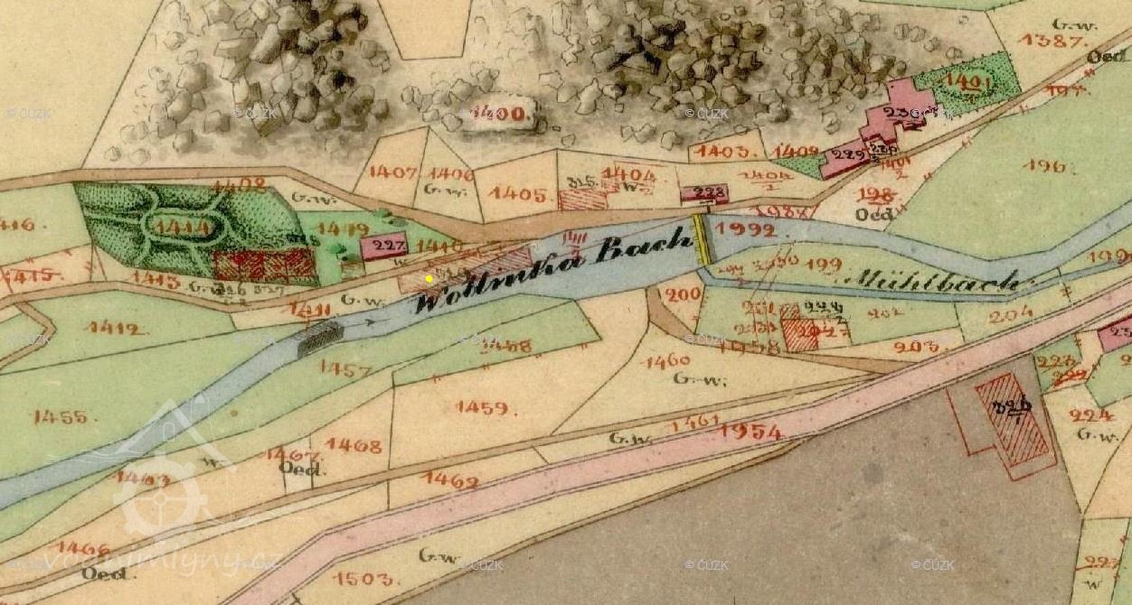 Johan Steibrener ve městě vlatnil mnoho objektů, mimo jiné také pilu postavenou cca 1 km za městem proti proudu Volyňky, kde se mimo jiné vyráběly přepravní bedny.