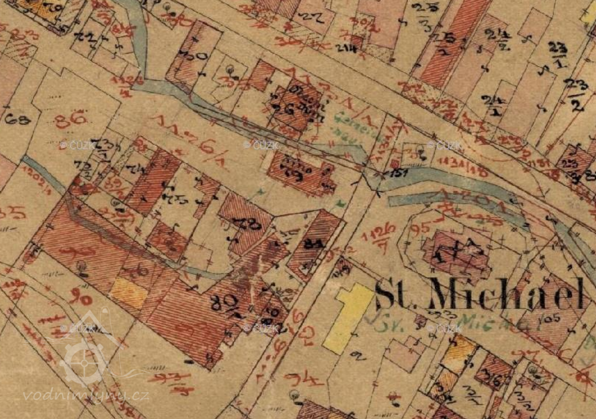 U vykopávek středověkého mlýna nebyl nalezen náhon, předpokládá se vrchní vedení vody přes vantroky.