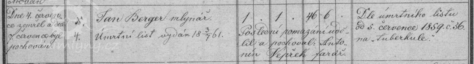 4. 6. 1859 zemřel mlynář Jan Berger ml., 46 let