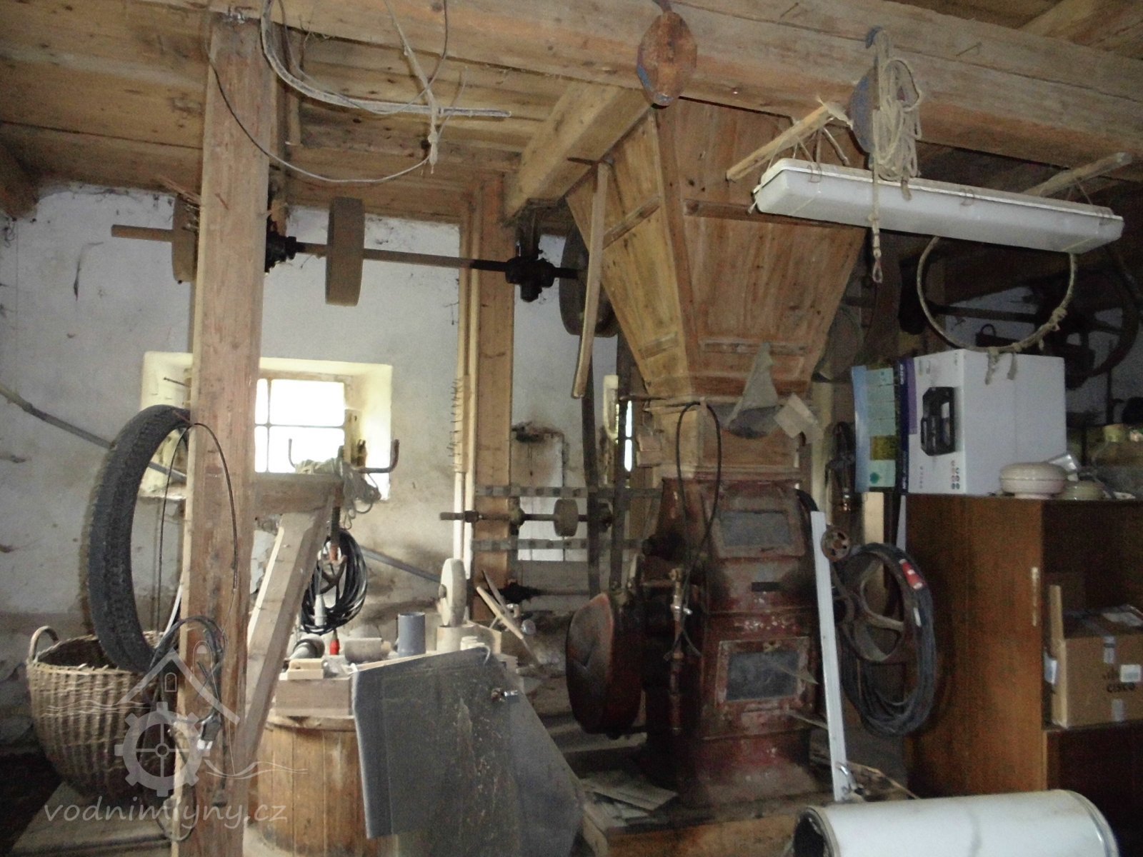 mlýnice, 2014, © Veselý, (Prvky na obrázku: transmise, řemenice, převody, kamenné složení (šrotovací, mlecí), válcová stolice, zásobník, násypka)