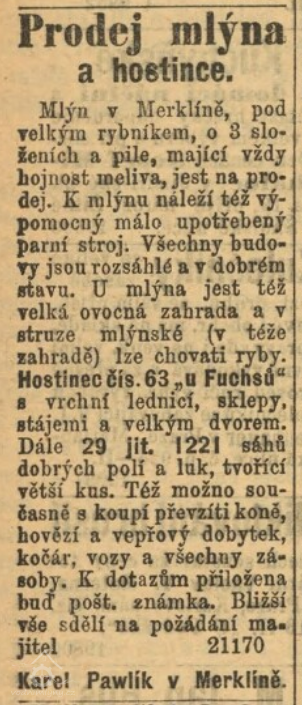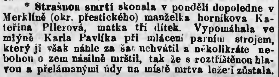 V r. 1884 zde zahynula při mlácení obilí Kateřina Pilerová, byvši zachycena parním strojem. (RR)