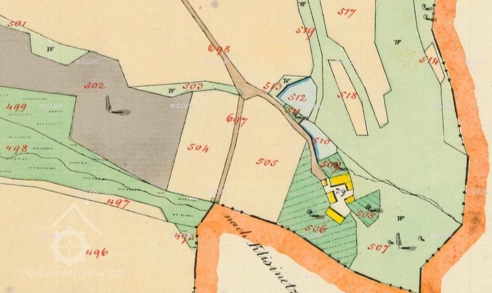 Z velkého zaniklého Hruškovského rybníka v sousedství (dnes louka, dochovala se mohutná hráz) byla voda vedena přes malý vyrovnávací rybníček (dochován) a z něj dřevěným vantrokem na vodní kolo (nedochováno).