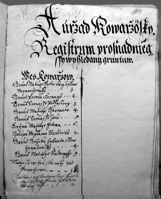 Vodní mlýn stával na místě nynější samoty Budař u Kovářova čp. 201 (dříve čp. 31) nejpozději na počátku 16. století. Jeho tehdejší název „Hruškovský” pocházel nejspíše od vladyckého rodu Hrušků z Trkova, kteří se stali majiteli Kovářova na konci 15. století.