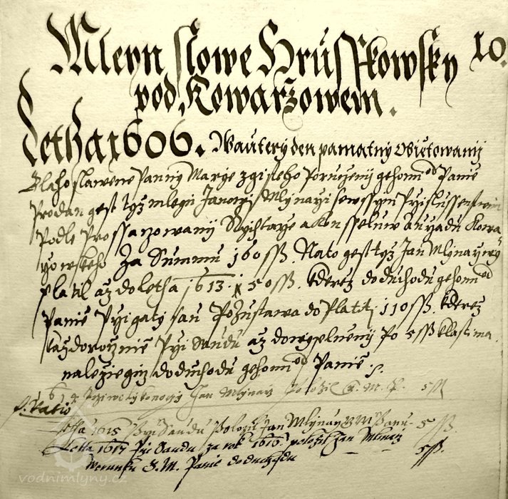 První písemná zmínka o existenci mlýna pochází z doby před rokem 1604. Panský mlýn Hrušků z Trkova, kteří vlastnili blízký Kovářov, tu však stál zřejmě již na počátku 16. století. První zápis v gruntovní knize je z roku 1606. Na počátku třicetileté války byl mlýn (patrně dřevěný) zničen a již nebyl obnoven. Na jeho místě byla roku 1640 vystavěna zemědělská usedlost s roubeným domem, který se dochoval dodnes. (RA)