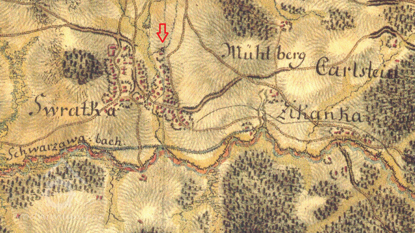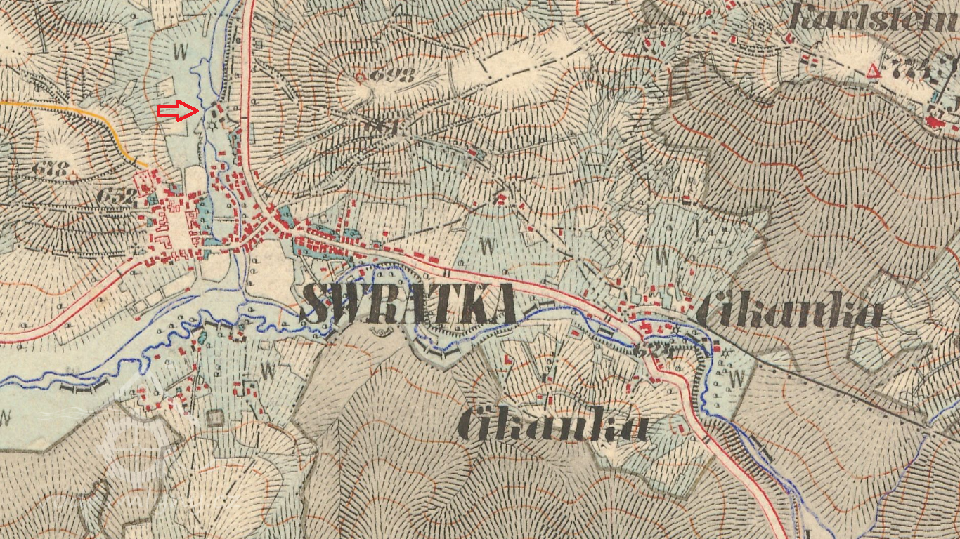 Dříve to byl mlýn, zvaný Horní, o němž je první zmínka z roku 1654. V Josefinském katastru je uvedeno, že „mlýn je to od nepaměti“. Vedl k němu náhon z potoku Řivnáč, zbudovaný od silničního mostu na začátku Svratouchu. Součástí byla i pila na řezání klád. Vodní pila měla výkon 2 HP, mlýn byl poháněn jedním kolem. Roku 1872 je uvedeno: vodní kolo má průměr 4.1 m, šířku 0.53 m a 1 obyčejné složení. V roce 1905 mlýn zanikl.