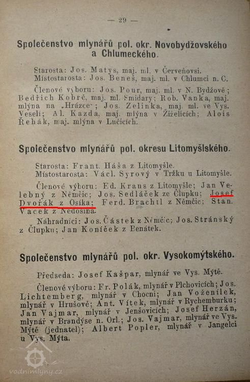 1899 - Jos. Dvořák členem výboru Společenstva mlynářů pol okr. Litomyšlského (Fr. Duška, Kapesní kalendář mlůn. česko-moravských, r. 1899) (HŠ)