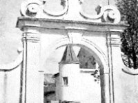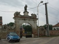 Monumentální pozoruhodně utvářená a poněkud rustikalisovaná brána z druhé poloviny 18. století se sochařskou výzdobou.