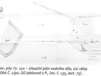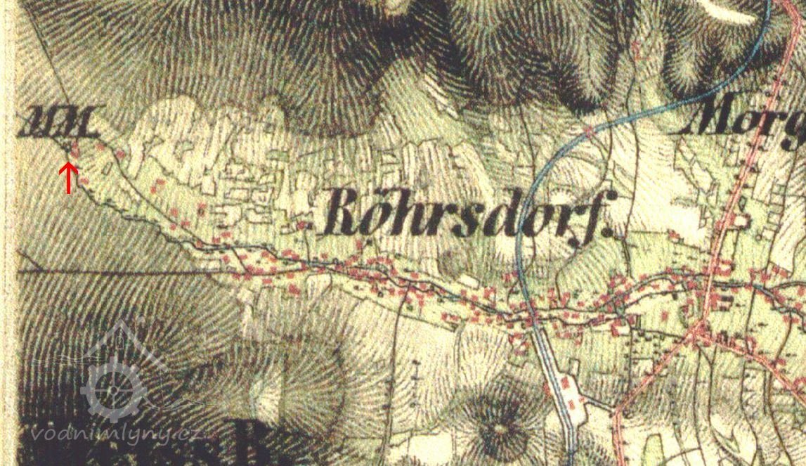 1874 normován poblíž nového rybníka pod ppilou zaražen dubový kůl s destučkou na hlavě s nápisem "1874 Josef Jarisch Röhrsdorf". Jelikož při revizu 1908 nebyl nalezen, byla zde umístěna nová značka. V nádrži postavené kol. 1869 byla akumulována voda pro další vodní díla níže po toku.
