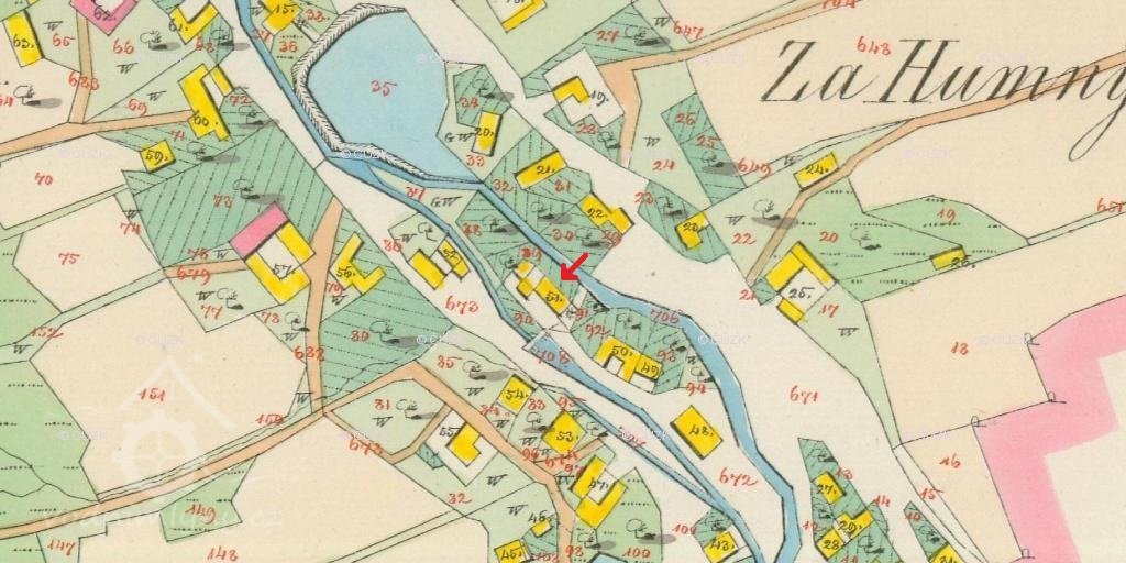 PopisV roce 1930 mlýn pohání kolo na svrchní vodu s průtokem 0.074 m3/s, spádem 4.4 m o výkonu 2 HP, prům. 440 cm.