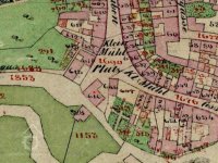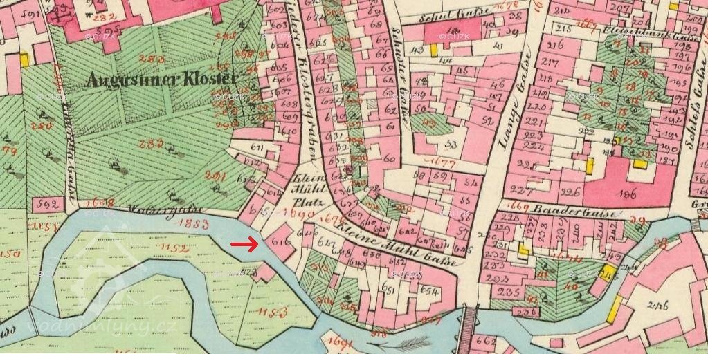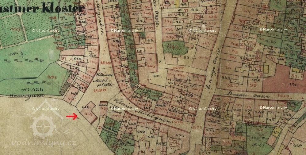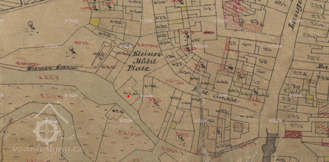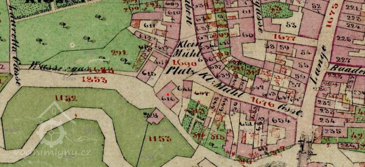 Menší ze dvou městských mlýnů stával před hradbami Města, v polovině 19. stol.  měl čp. 453.