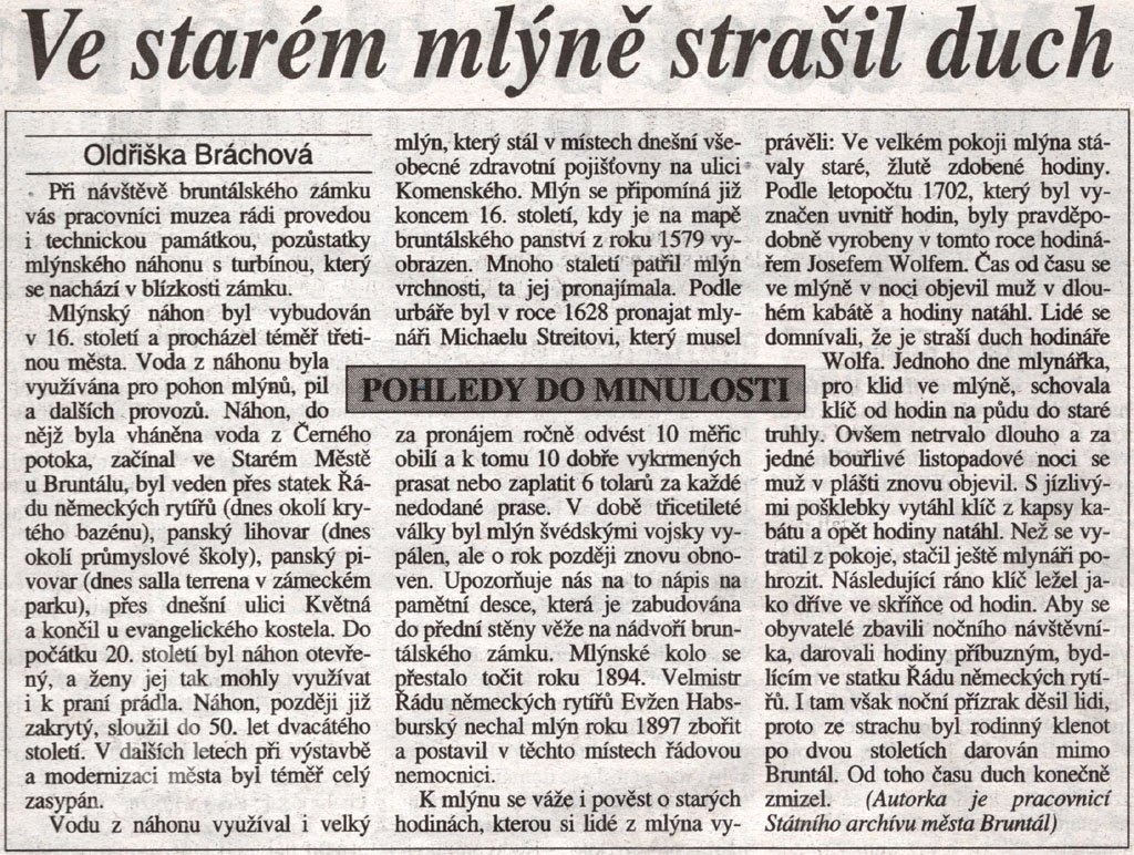 První zmínky o mlýnském náhonu ve městě pocházejí z roku 1579. Je zakreslen na plánu, který si dali zpracovat zájemci o koupi tehdejšího bruntálského panství.