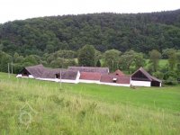 Budovy rozmístěny kolem průchozího obdélníkového dvora (typ většího selského statku)