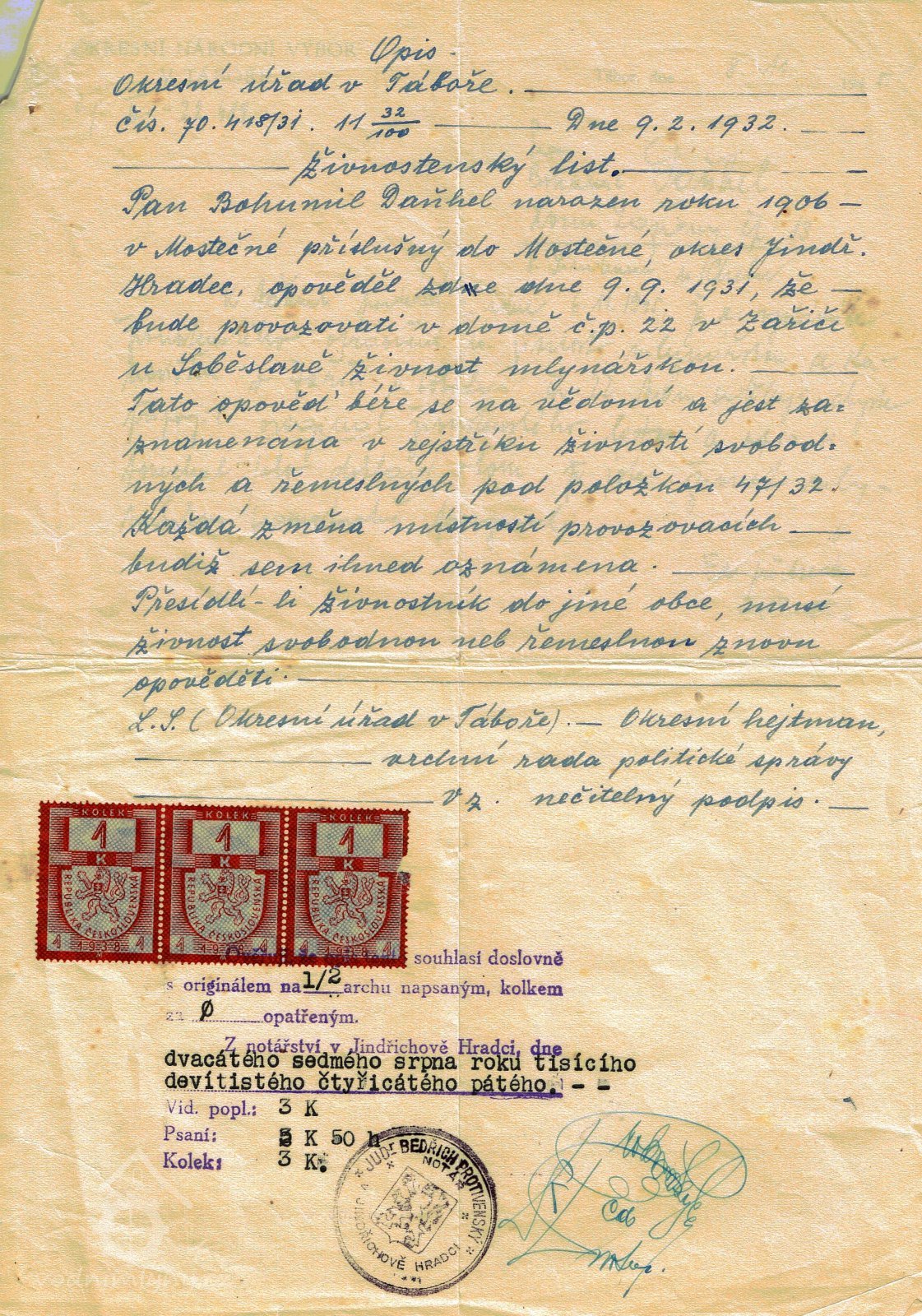 Bohumil Daňhel *1906 nájemce mlýna v letech 1932 až 1945