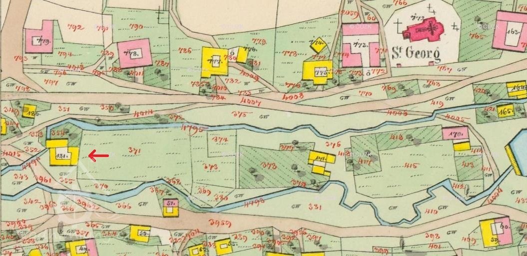 V roce 1954 je mlýn již zbořený a místo kde stával zarostlé.