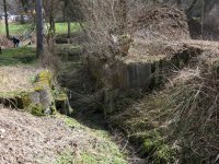 03 2023: Prostor bývalého mlýna zcela zplanýrován, zůstaly jen zbytky vodního díla a otisk na zdi přilehlé budovy. (Jan Moravec)
