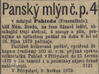 V r. 1879 byl mlýn nabízen k pronájmu na 6 let. (RR)