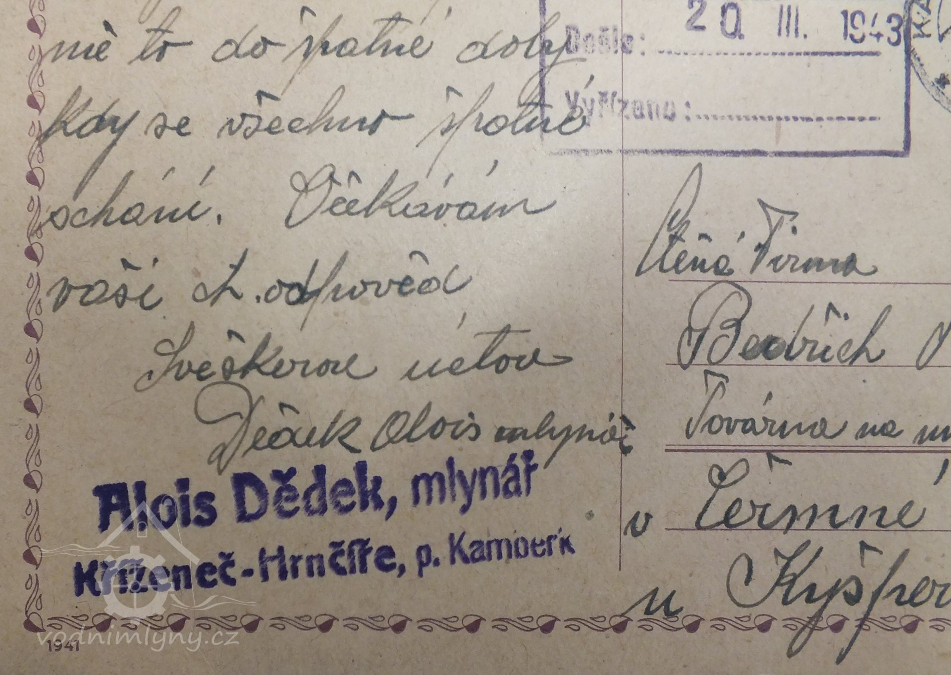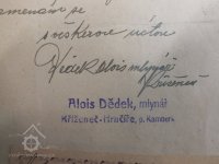 Jméno majitele mlýna a bydliště: Alois Dědek, Vilice-osada Kříženec, Hrnčíře 27, p.Kamberk