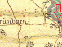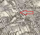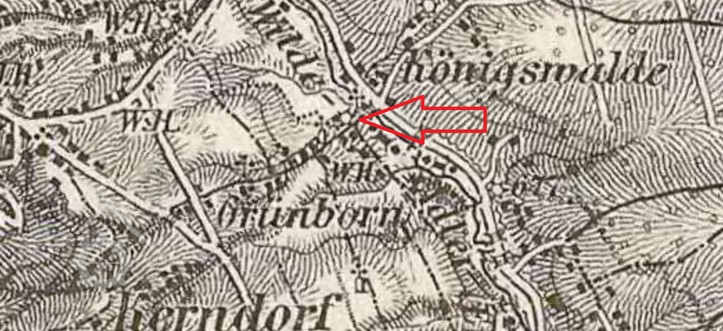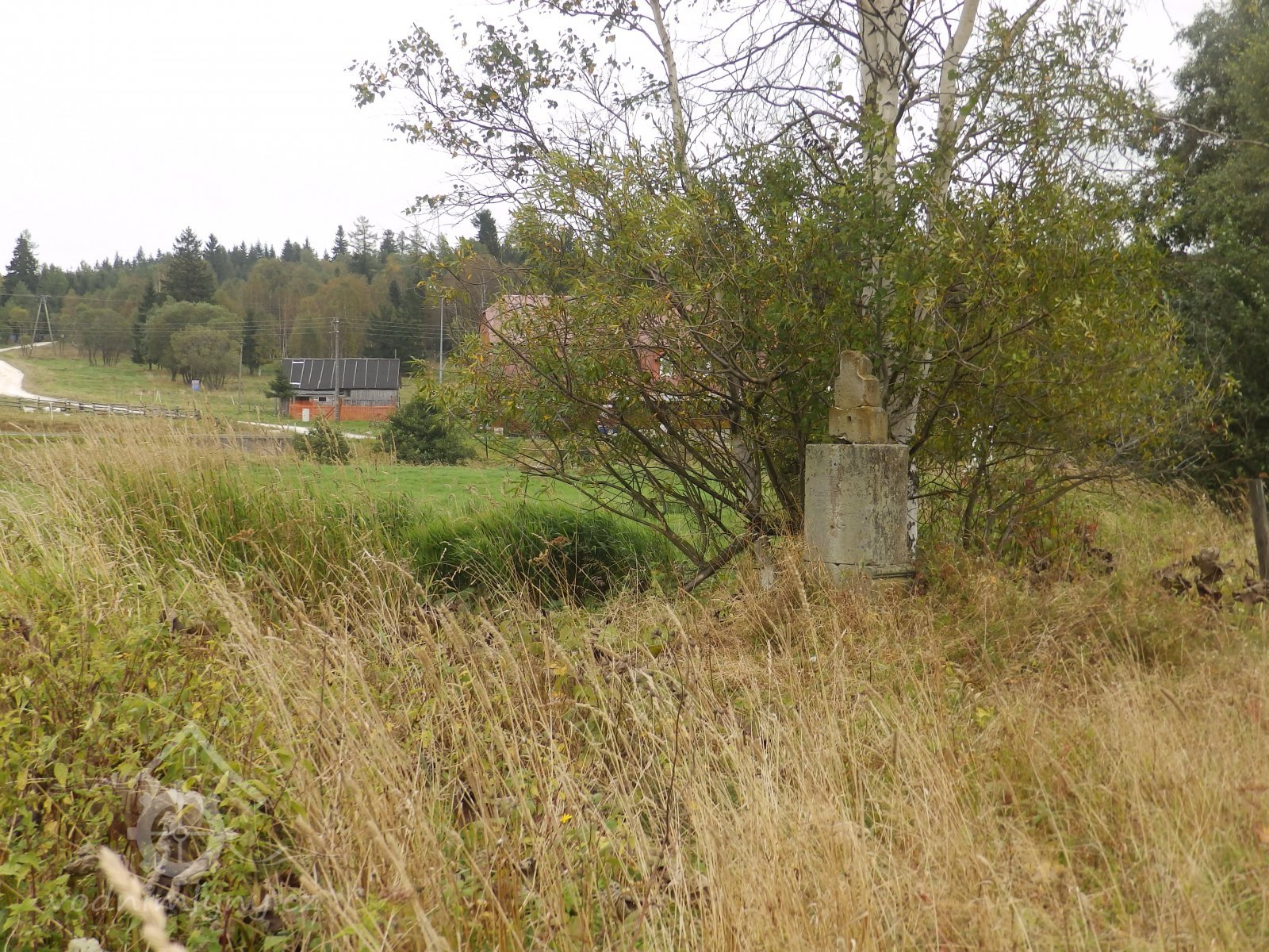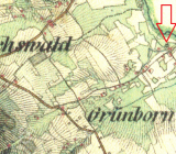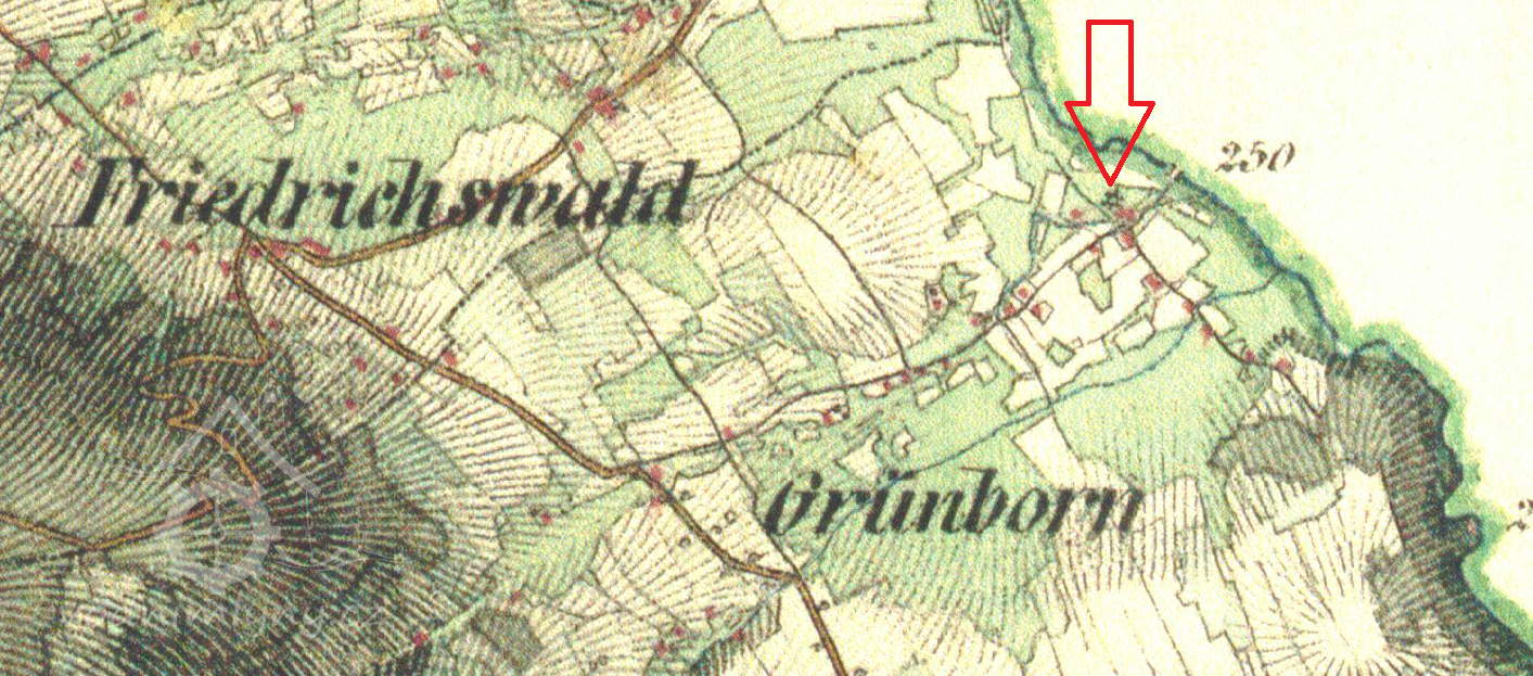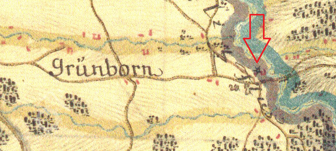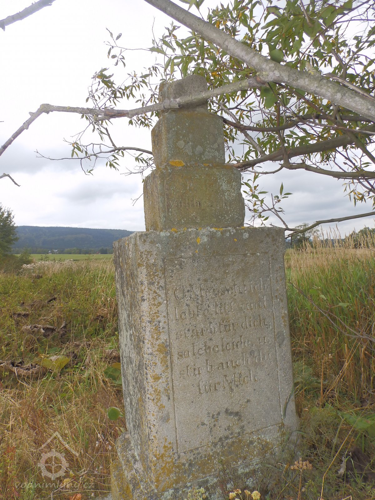 1887 Damián Wenzel postavil kamenný kříž u mlýna, dedikační nápiis: ERRICHTET / DAMIAN WENZEL / MÜHLMEISTER / AUS GRÜNBORN / 1887