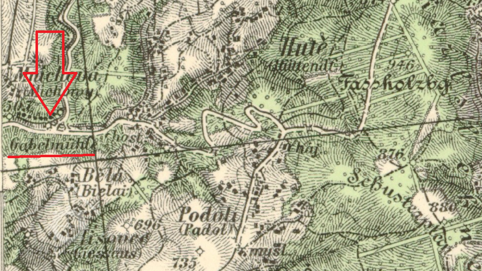 Novější mlýn (vznikl před polovinou 19. stol.) na soutoku Bělé a Huťského potoka (odtud název, Gabel = vidle, tedy rozvětvení), pod v té době již zaniklým Buschmühle. 17. července (nebo spíše 14. dubna) 1921 se zde odehrála tragédie, kdy mlynář Jan Schmidt mlýn v alkoholickém deliriu zapálil a pokusil se o sebevraždu, z čehož pak vznikla legenda, že tak učinil na protest proti nacionálně motivovanému bojkotu mlýna ze strany okolních Němců. Mlýn již nebyl obnoven, trosky byly rozebrány a mlýniště zčásti zasypáno při stavbě mostu a rozšiřování silnice ze Skuhrova na Deštné,