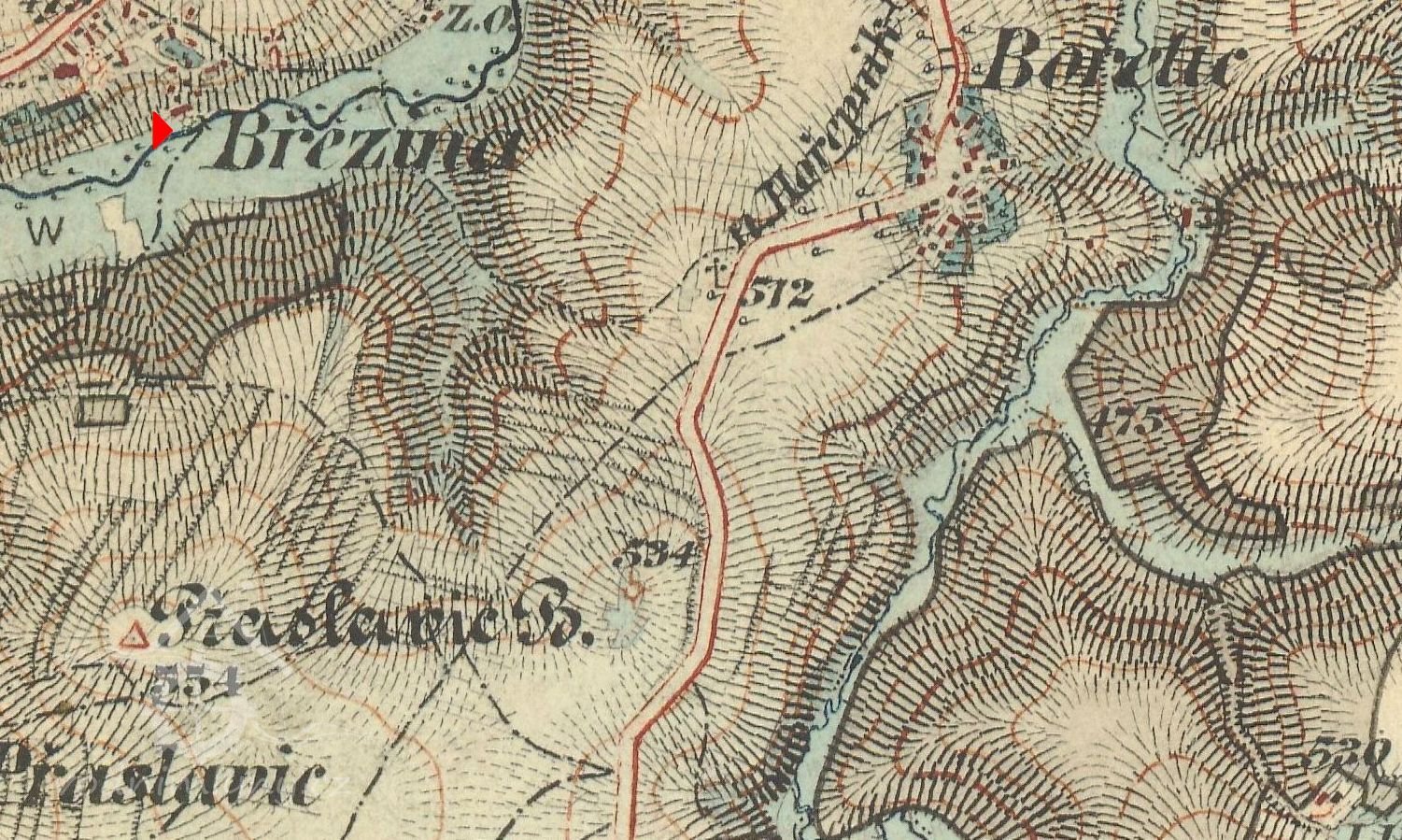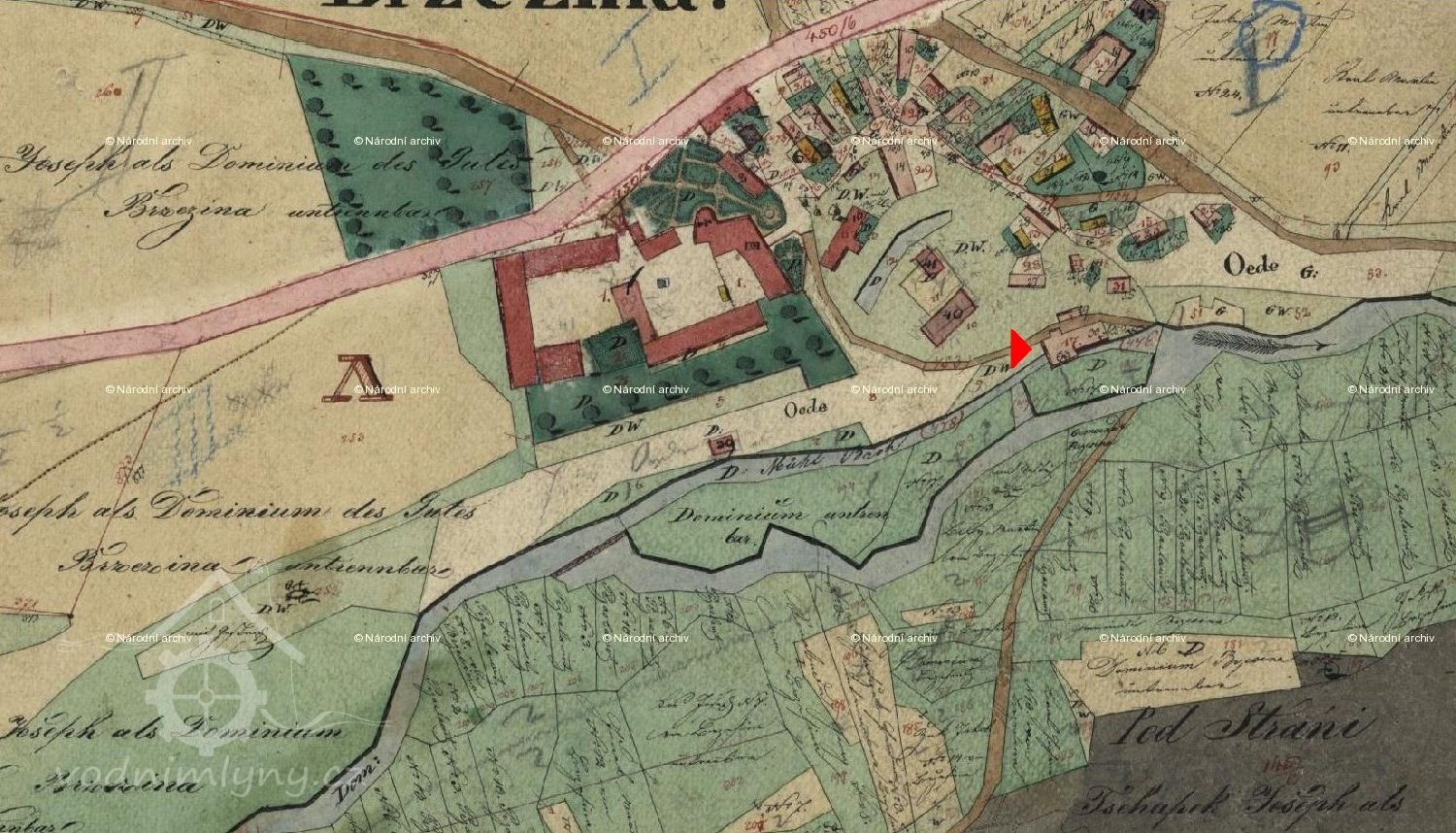 Z Potoka Trnavy nahání se voda jezem do strouhy 80 m dlouhé, kterouž se přivádí do vantrok a z těchto stavidlem na dřevěné vodní kolo na spodní vodu o průměru 4,5 m a šířce 1,18 m, jímž se čerpá voda do trub vodovodu přivádějící užitkovou vodu do zámku a hospodářského dvora v Březině.