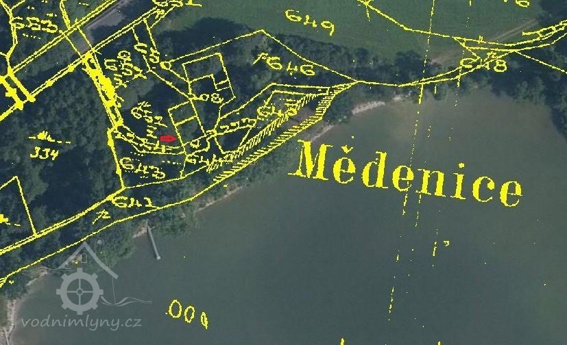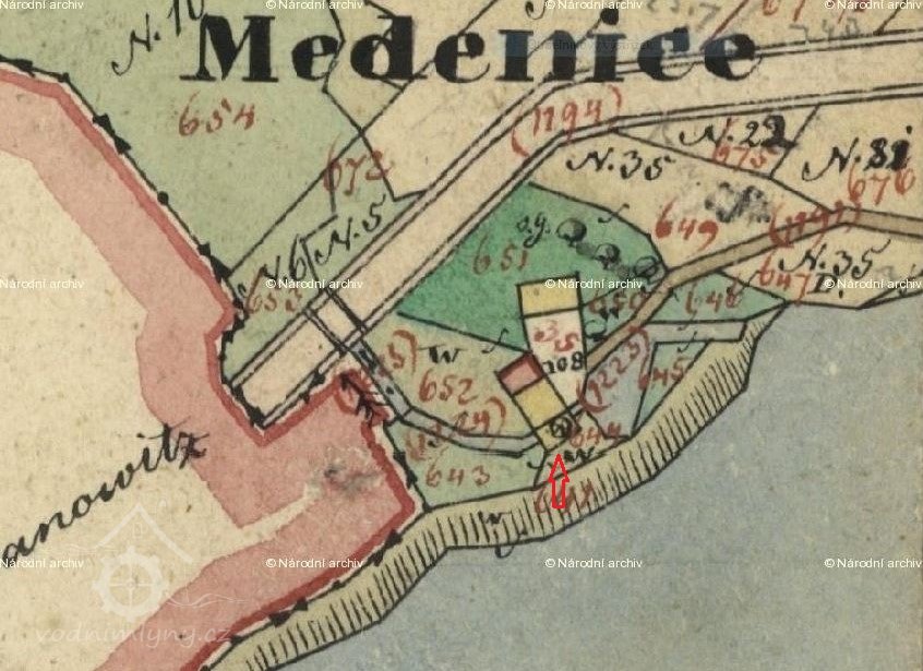 Na severovýchodním konci hráze pouští se voda stavidlem 1 cm vysokým a 35 cm širokým do trouby, jíž vlévá se voda do nádržky a z této pouští se stavidlem 43 cm širokým a 40 cm vysokým do žlabu 30 cm širokého a 23 cm vysokého, jímž vede se voda na vodní kolo panského mlýna č. p. 35 v Paběnicích pod hrází Medenického rybníka ležícího.