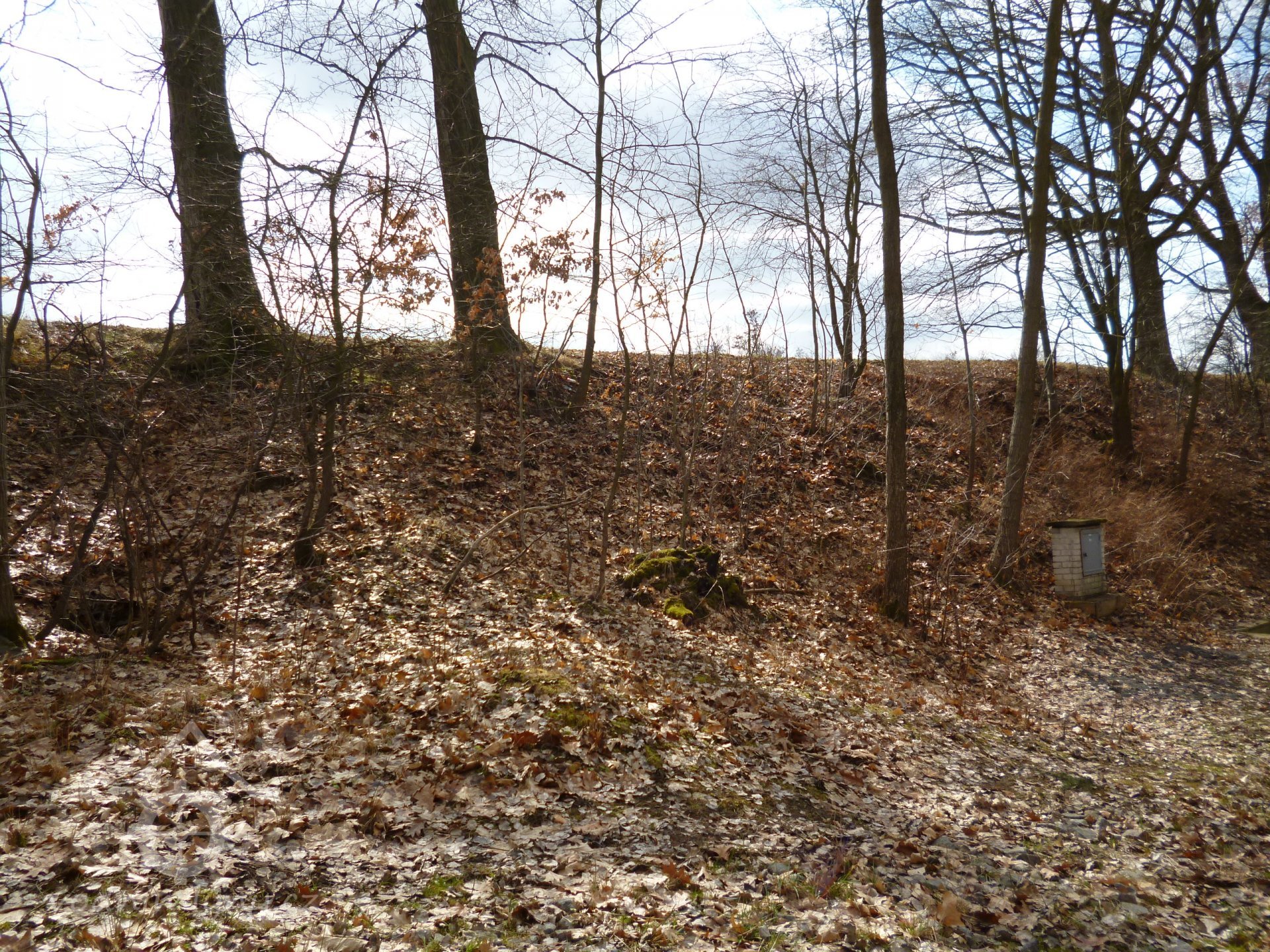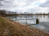 Na severozápadním konci rybníka jest hráz i8o m dlouhá a má tato hráz koruně od jalového splavu počítaje od 20 ke 20 m následující šířky: 3.5, 5.5, 3.4, 4.3, 4.7, 3-8,4.9 m, hráz jest na vnitřní straně kamenem terasená na vnější straně drnem porostlá ve stavu dosti dobrém, uprostřed hráze jest dřevěné potrubí k vypouštění spodní vody a v nejhlubším tomto místě je hráz na zevnější straně po svahu měřeno g m vysoká, od tohoto místa k oboum koncům pozvolna výšky ubývá.