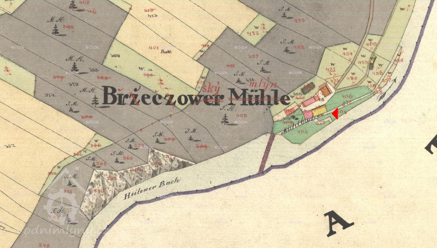 Mlýn zvaný Břečovský dostává vodu z potoka Hejlovky. Nad mlýnem ve vzdálenost 50 m je na potoce zřízen jez. Jez je směrem doprava snížen pro odchod přebytečné vody. V levém rohu je stavidlo jímž se pouští voda ku mlýnu o šířce 200 cm, výšce 105 cm.