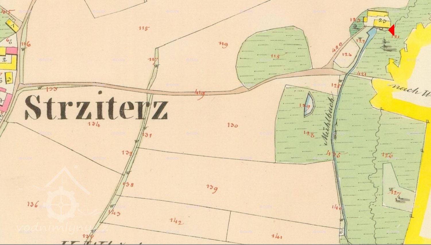Voda přicházející potůčky od mlýna Lampus v Sedlišti a od mlýna Josefa Nováka čp.19 ve Stříteži spojujej se asi 0,5 km nad mlýnem a vtíká u mlýna do malé nádržky, z které se vede do vantrok 4 m dlouhých a 95 cm širokých. Z vantrok se vede voda 2 žlaby na dvě vodní kola. Žlab na mlýnské kolo je 35 cm široký, žlab na stupní kolo je 37 cm široký. Přebytečná voda padá tímto druhým žlabem přes stupní kolo do odpadní strouhy.