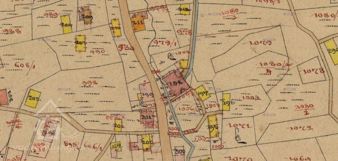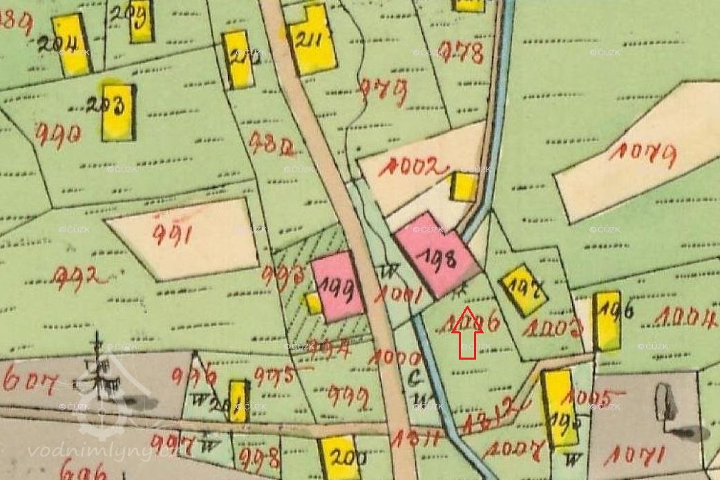 Normování vodního díla 1874: Náhon byl napájen přímo z odpadu mlýna čp. 41, měl šířku 2 stopy (0,632 m). Na konci náhonu byly před lednicí vantroky o délce 16,5 m a šířce 0,42 m. Vodní kolo na vrchní vodu mělo průměr 25 stop (7,9 m).