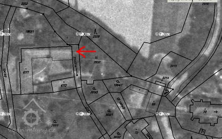 Na leteckém snímku z počátku 50. let 20. století jsou vidět zachované budovy mlýna.