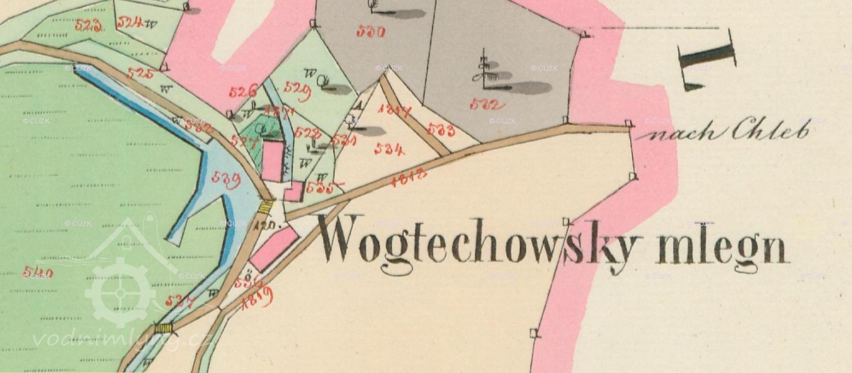 První mlýn po proudu Brejlovského potoka od Podměstského mlýna v Netvořicích se nazývá „Vojtěchovský“ nebo také „Vojtěchov“ a nese číslo popisné 74. Dle strojopisu Vojtěcha Losenického, který posloupnost mlynářů odkazuje na poznatky jakéhosi dr. Polaufa, existoval tento mlýn jako vrchnostenský již v 17. století. Nazýval se „Podnetvořický“ či „Vazovnický“, měl jedno vodní kolo na svrchní vodu. Významným rodem, žijícím a pracujícím na mlýně, byl od 19. století rod O(t)čenášků. Losenický zmiňuje Jana Očenáška (1796-1858), syna netvořického měšťana, majitele domu a kostelníka Matěje Očenáška. Jan Očenášek měl syna, taktéž Jana (1829 - 1887), který