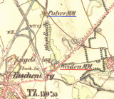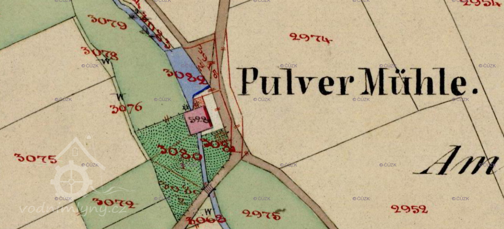 Malý mlýn severně od centra starého Mostu, původně snad skutečně na střelný prach, na vojenské mapě však značen jako mlýn na mouku (MM). V roce 1930 nebyl v provozu, v roce 1950 již nestál.