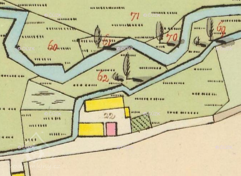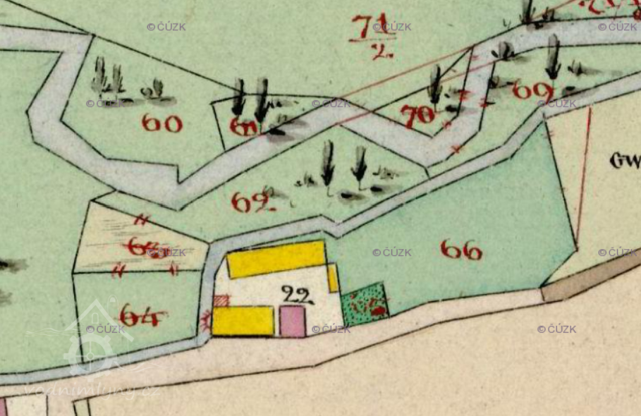 Popis1930: 1 kolo na svrchní vodu, hltnost 0,205 m3/s, spád 2,9 m, výkon 5,2 HP
