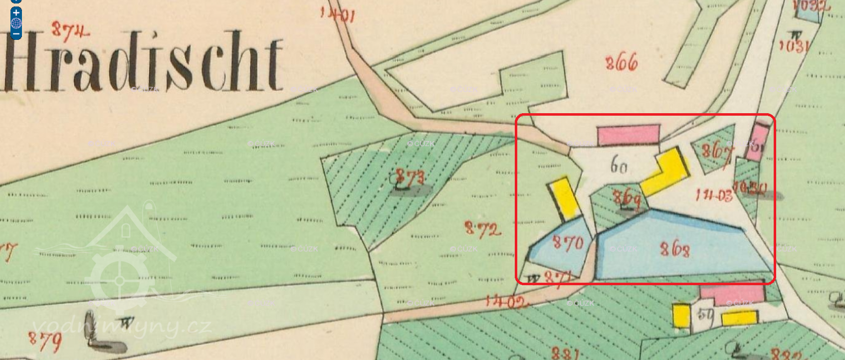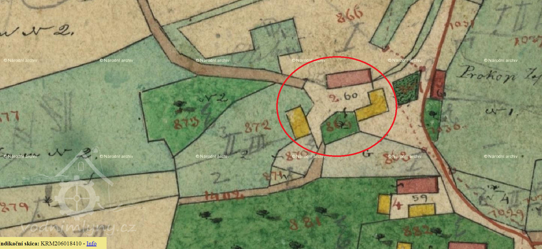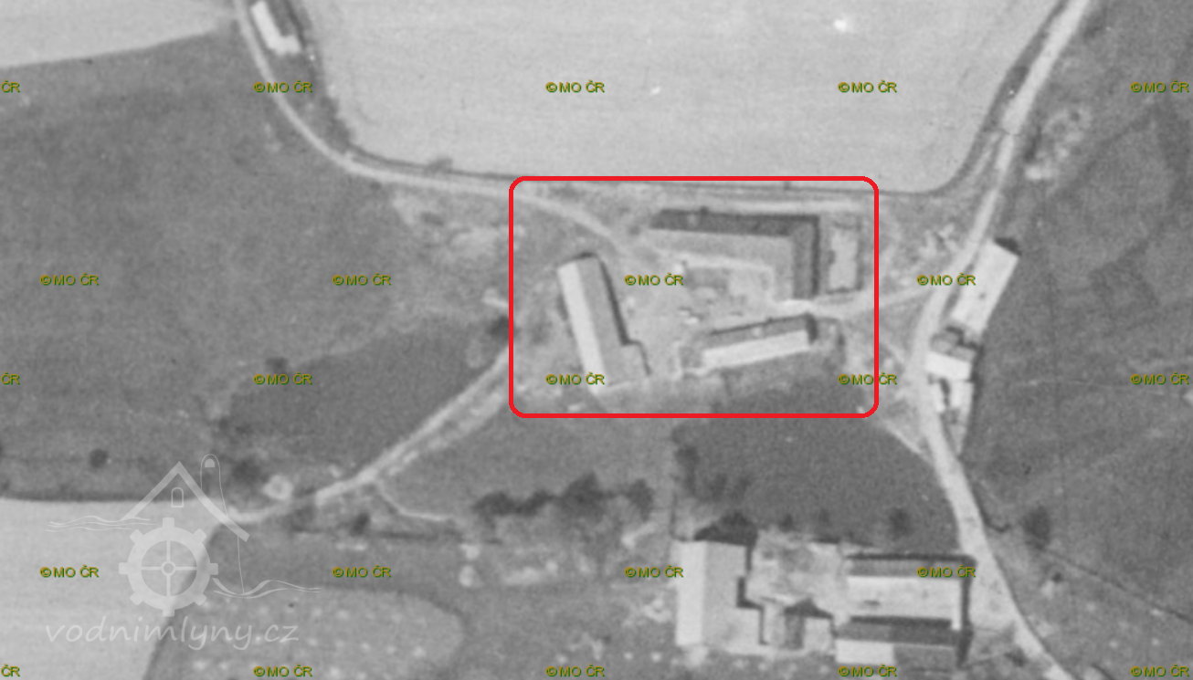 Horní rybník nad statkem, druhý (dolní) rybník na návsi vedle statku patrně k pohonu nevyužíván.
