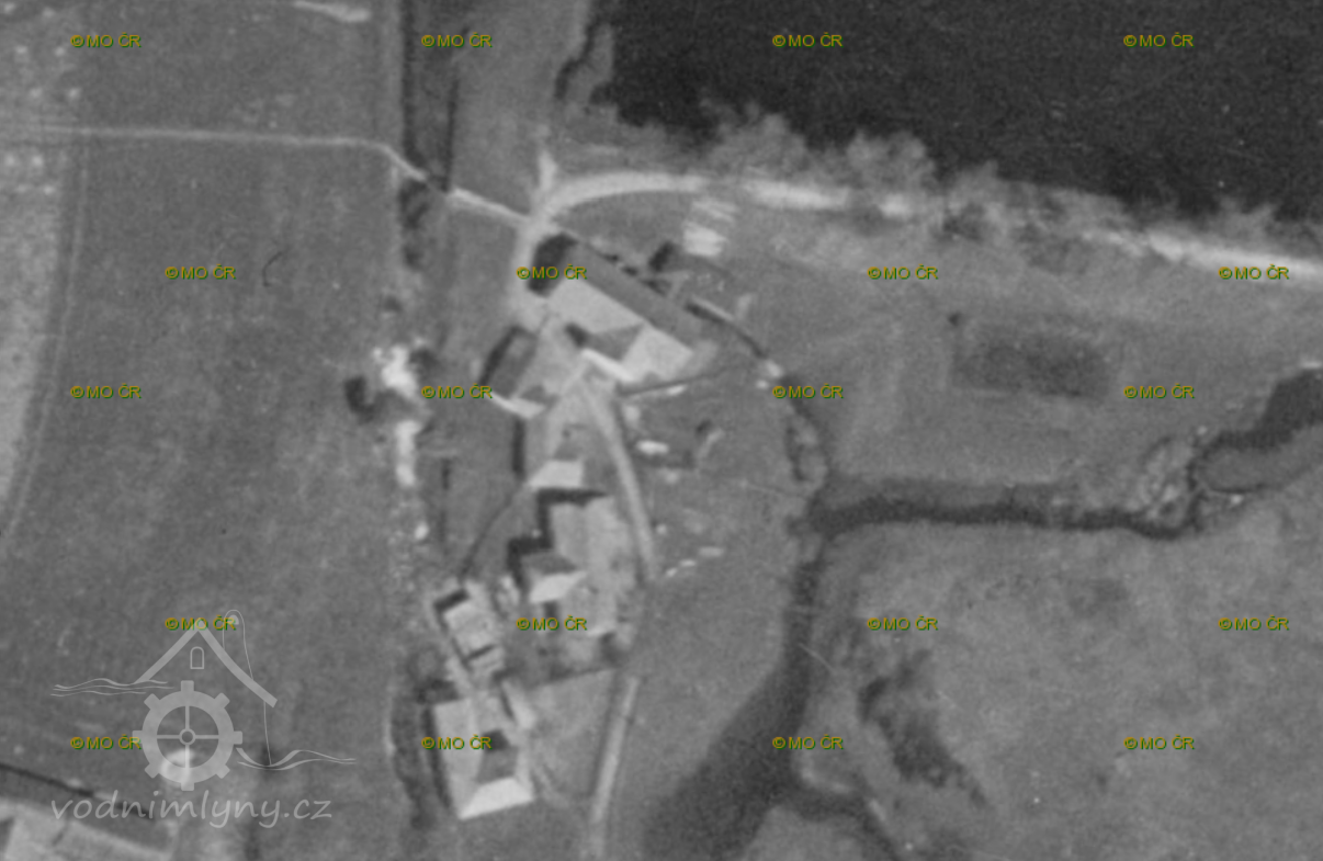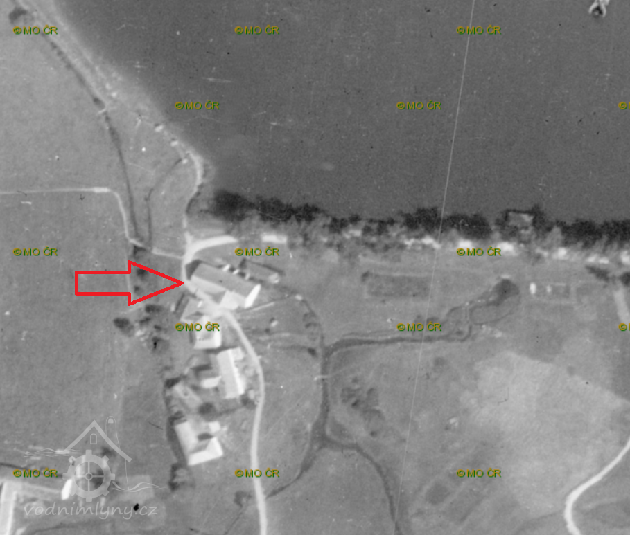 Mlýn s pilou a elektrárnou pod velkým rybníkem Olšinou, zbořen po roce 1950.