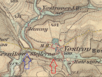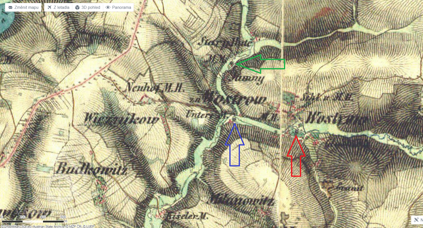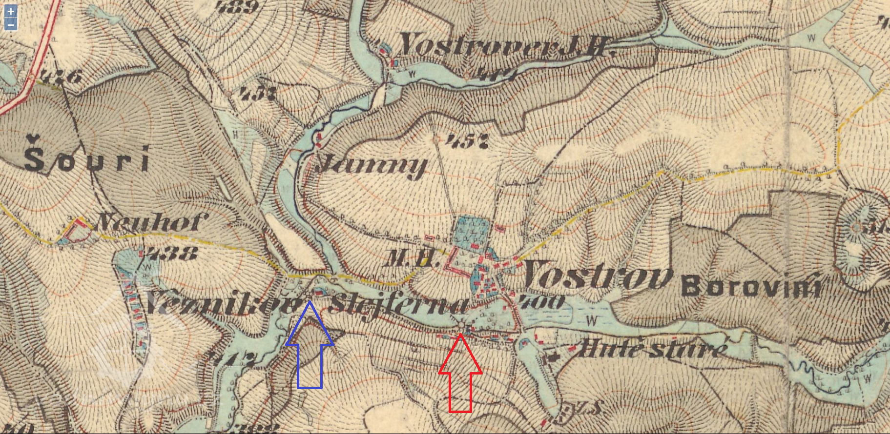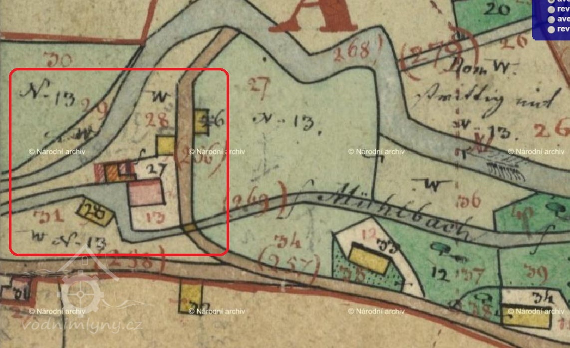 Mlýn horní v Ostrově dříve panský léta Páně 1702 postavený patřil Jiřímu Simenovskému.