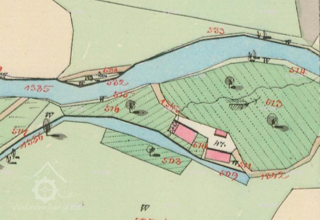 Obytná mlýnice a stodola rovnoběžně, v jedné linii s mlýnicí další budova neznámého účelu, z níž však zůstaly jen opěrné zdi a pilíře.