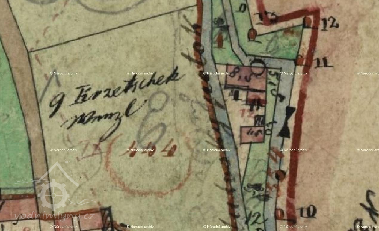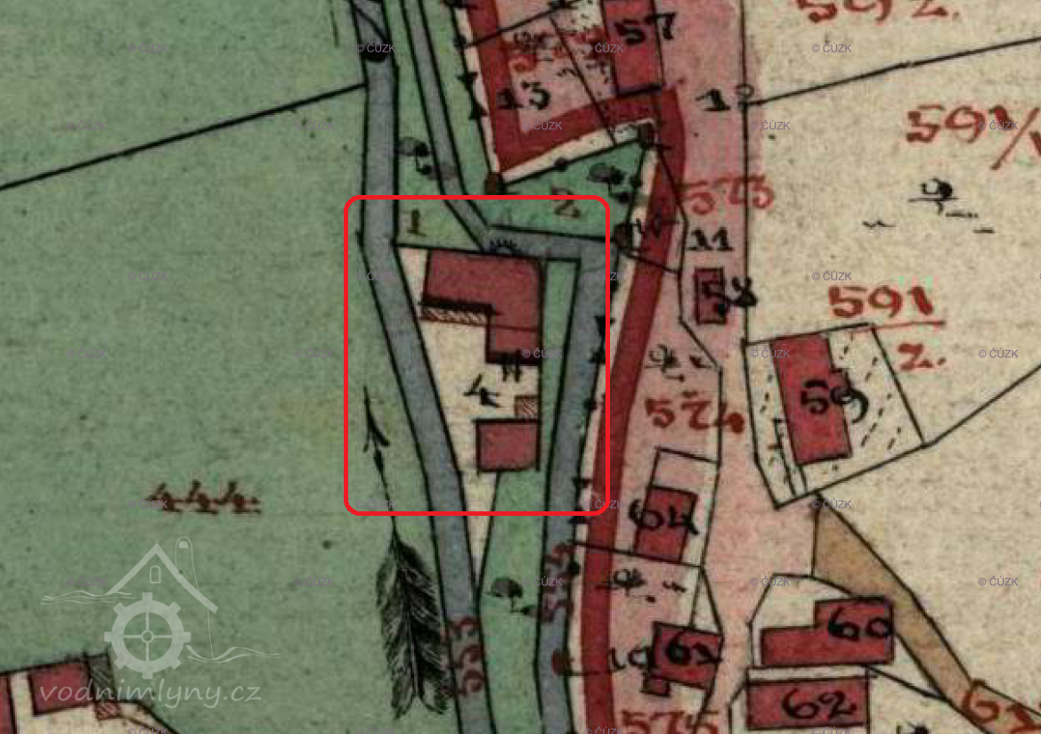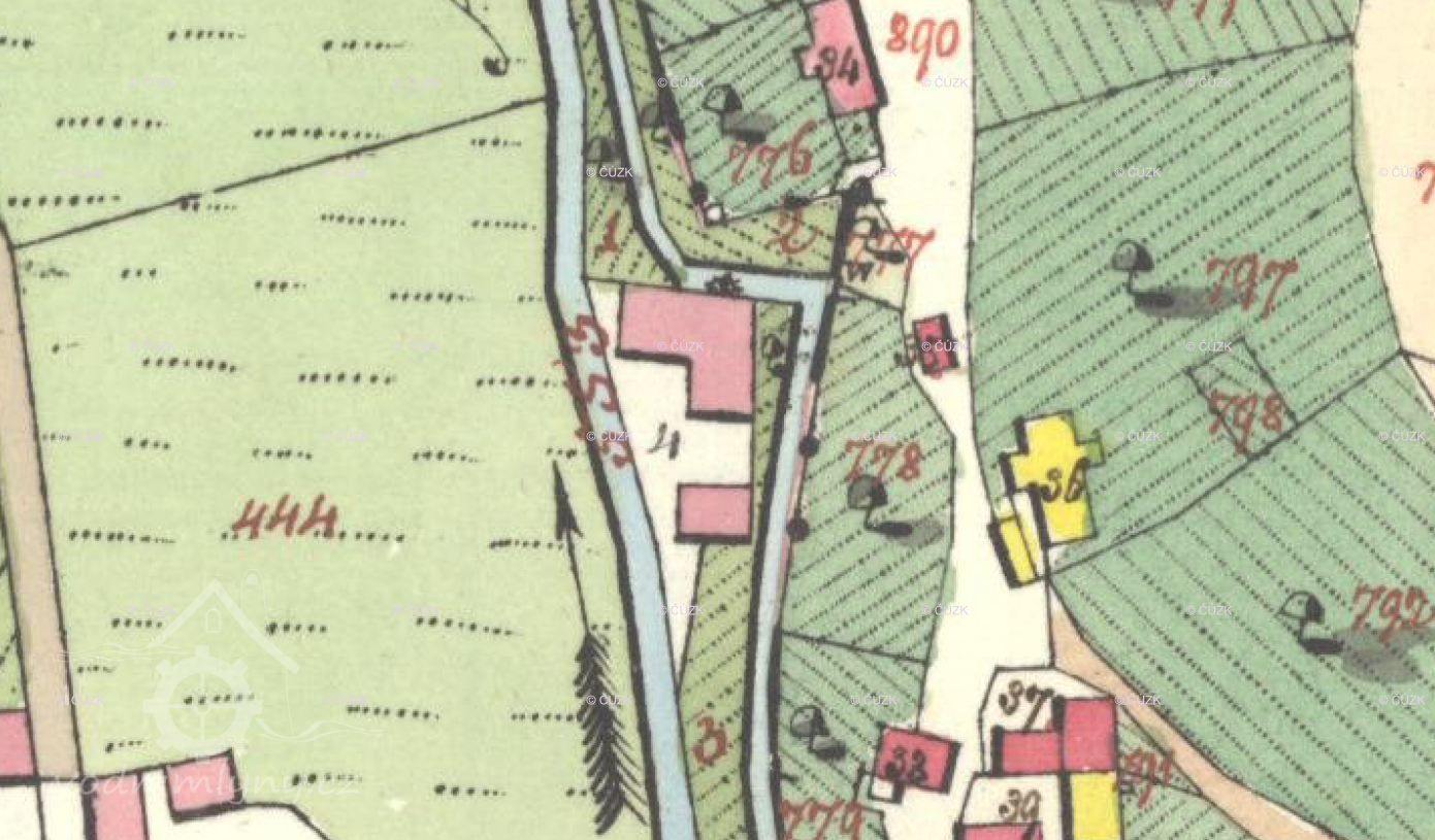Popis1930: 1 kolo na svrchní vodu, hltnost 0,055 m3/s, spád 4,2 m, výkon 2 HP (nejmenší na Lounsku)