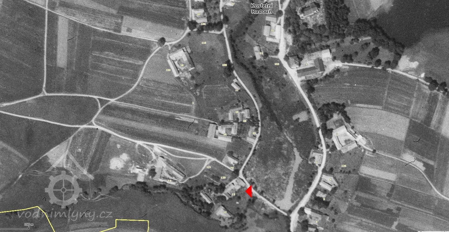 Poměrně malý mlýn pod hrází rybníka, který se nazýval v Návesní, v obci Kostelní Radouň na Jindřichohradecku má dlouhou a asi i bohatou historii. První písemná zpráva je v gruntovní knize ze začátku 17. století. V roce 1638 kupuje grunt s mlýnem Václav Poláček a jeho jmenovci či rod jsou pak na mlýně více než 200 let. Mlýn měl před instalací Francisovi turbíny pouze jedno vodní kolo. V současnosti je stavení hezky opraveno potomky posledního mlynáře a turbína v provozu.