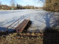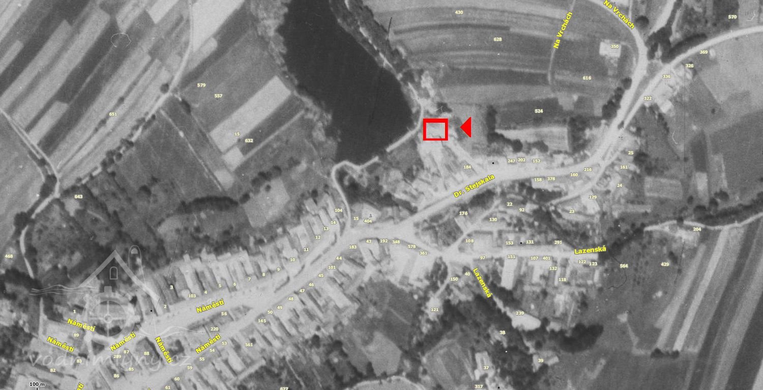 Má právo používati vodu z rybníka Lazna č.parc.1532. Pro výtok vody na mlýn je v hrázi zasazena roura 33x40 cm, která ústí do žlabu 37 cm širokého a 18 cm vysokého. Cejch není zasazen.