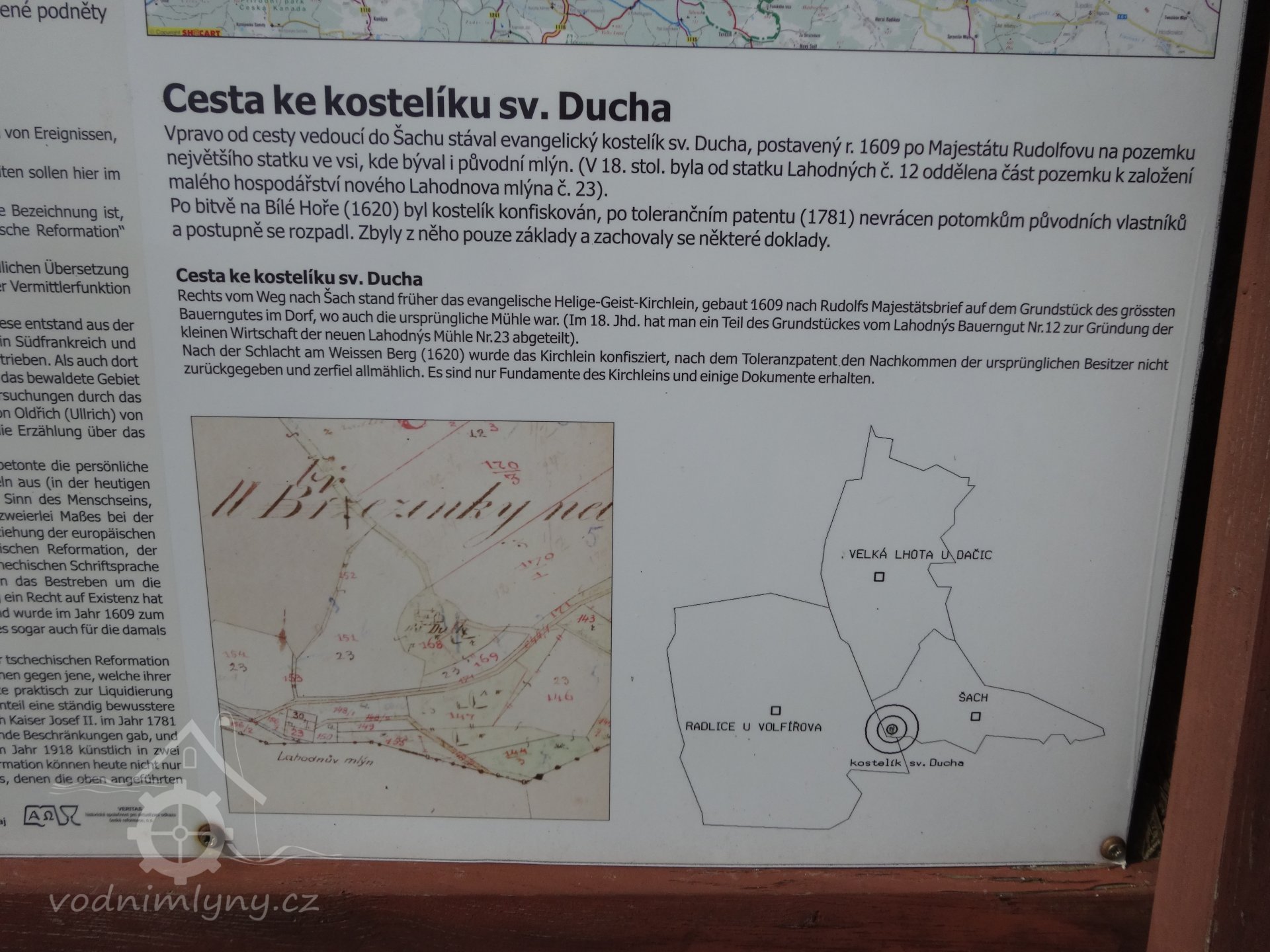 V údolí Volfířovského potoka je jedním ze mlýnů Lahodnův mlýn patřící k obci Šach. O vzniku mlýna dává základní informace jedna z tabulí Naučné stezky valdenské a české reformace. Mlýn vznikl někdy v polovině 18. století. Matrikami je doložen v r. 1783. V současnosti je mlýn v dobrém stavu asi z poloviny minulého století.