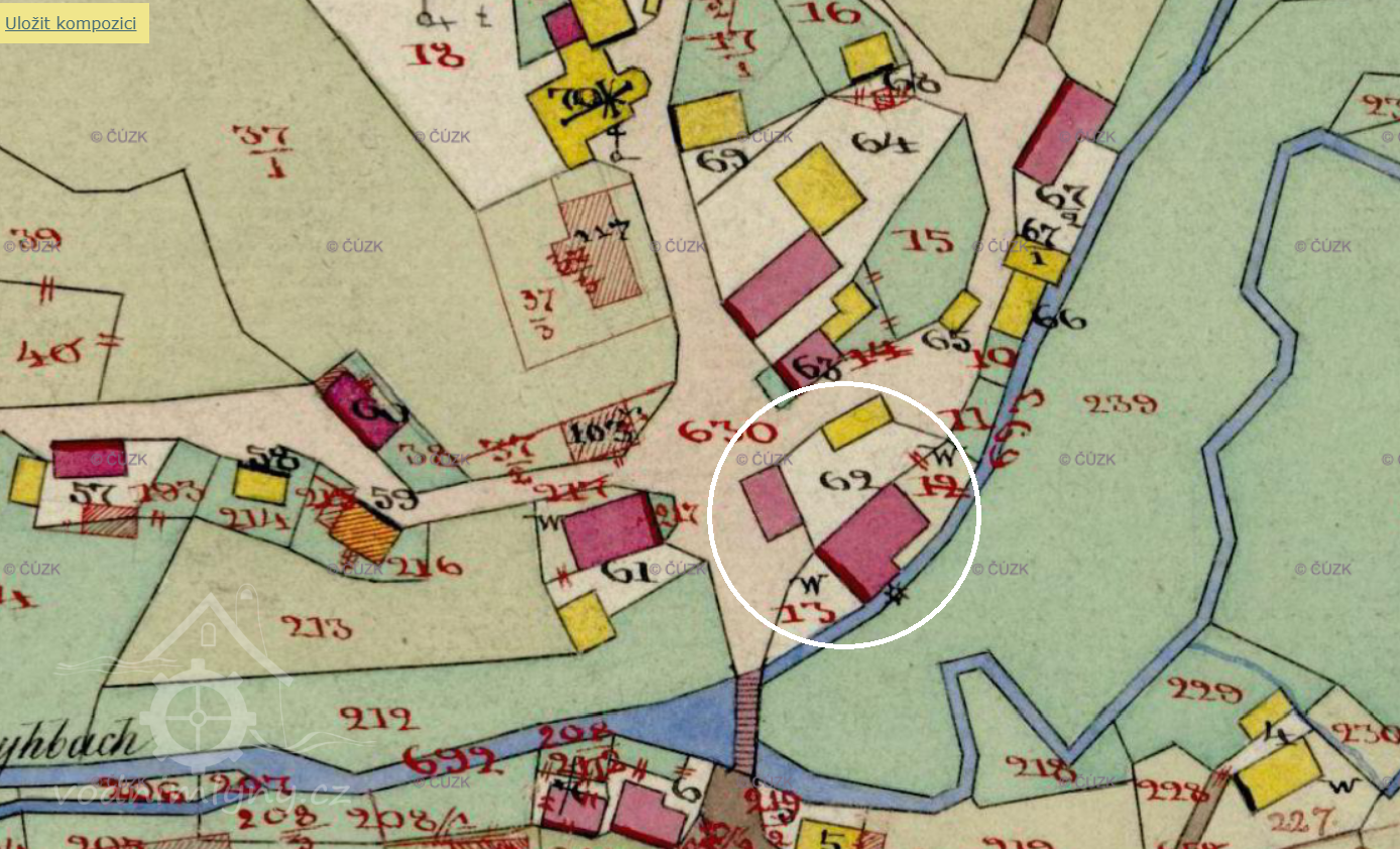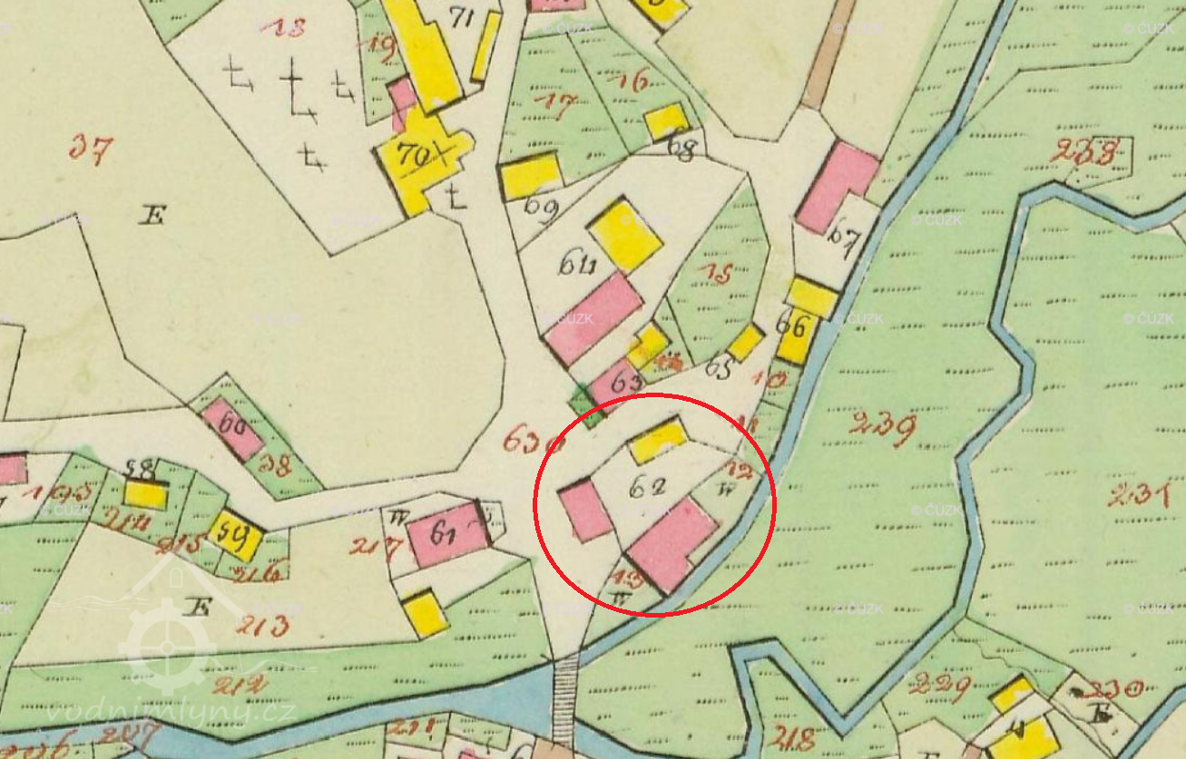 100 m dále na jv položený dřevěný objekt s vodním pohonem (čp. 19) byl patrně pilou.