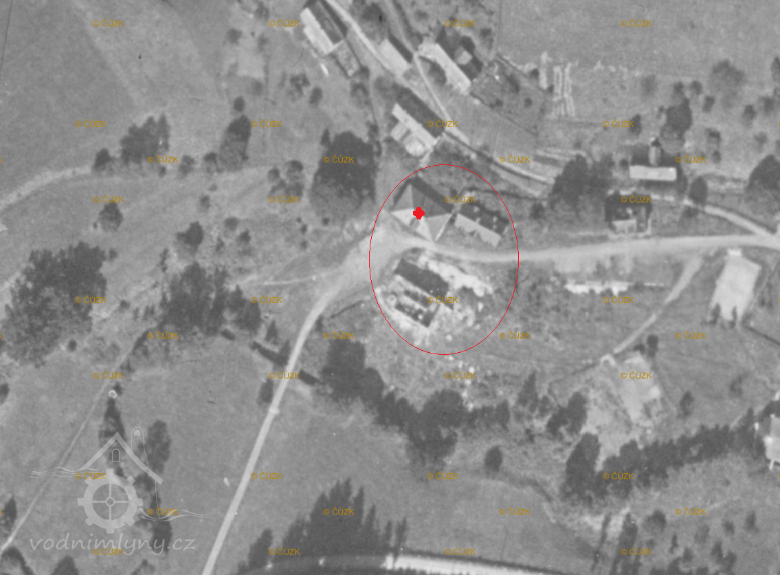 Na leteckém snímku z roku 1956 je vidět původní budova mlýna a pily v zachovaném stavbu. Nová provozní budova pily z konce 19. století je již bez střechy, viditelné jsou pouze obvodové zdi.