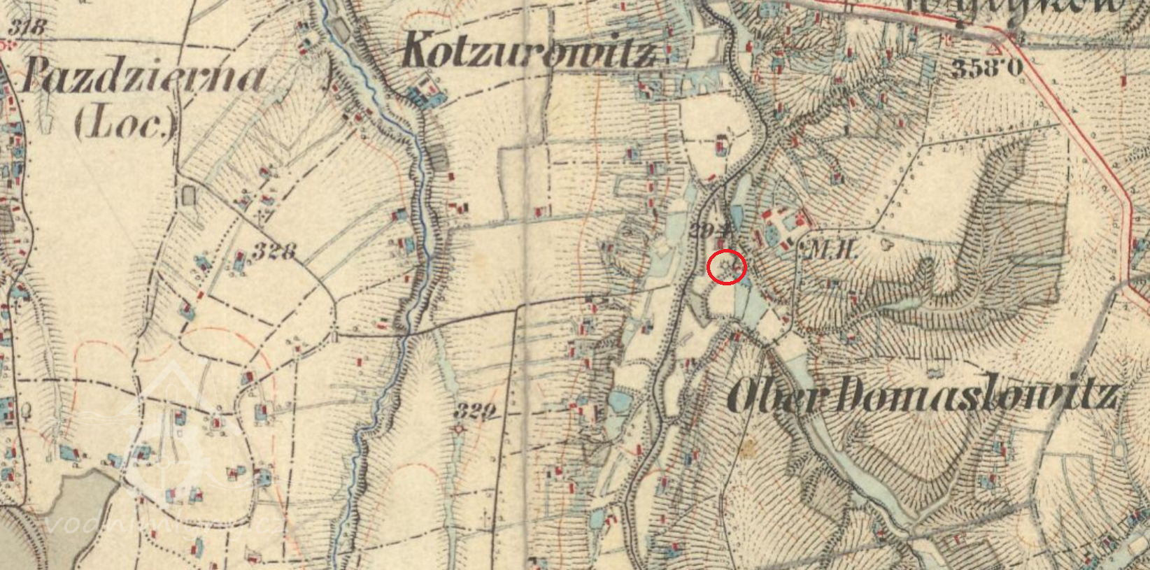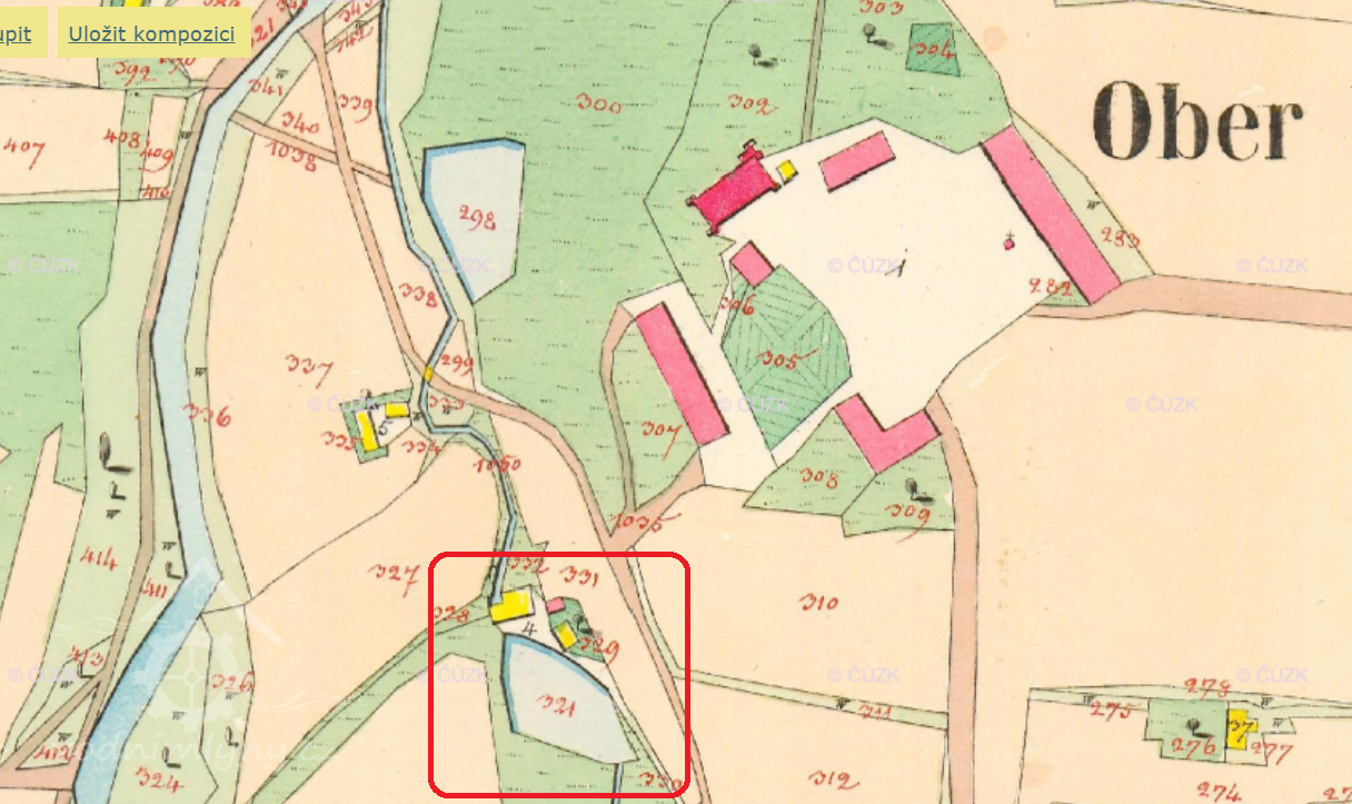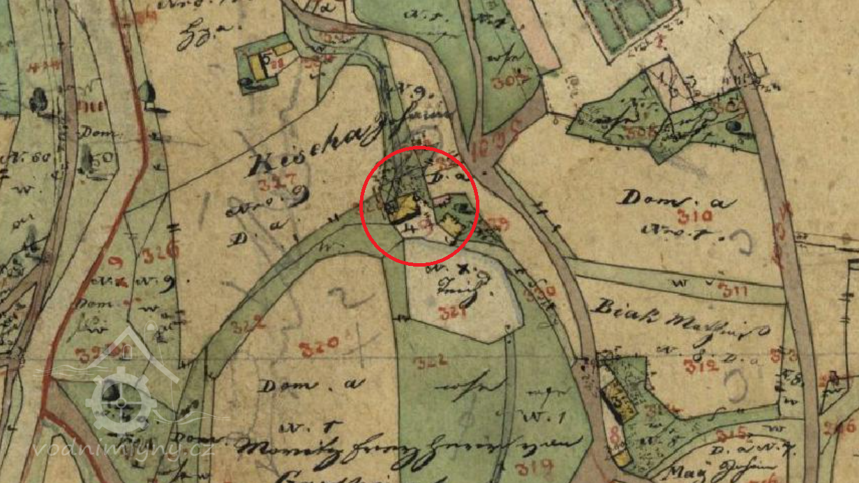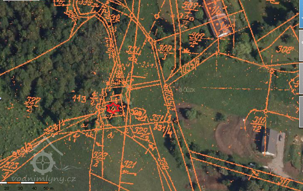 Zaniklý mlýn pod rovněž zaniklým zámkem.