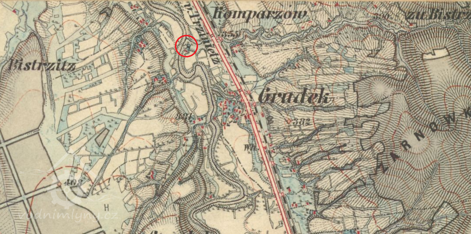 Zaniklý malý mlýn na severním okraji obce, jediný z trojice hrádeckých mlýnů, který se dá přesněji lokalizovat.