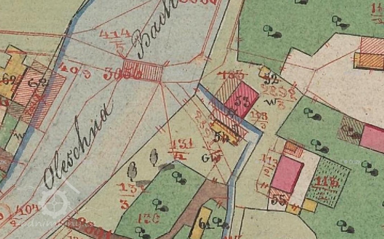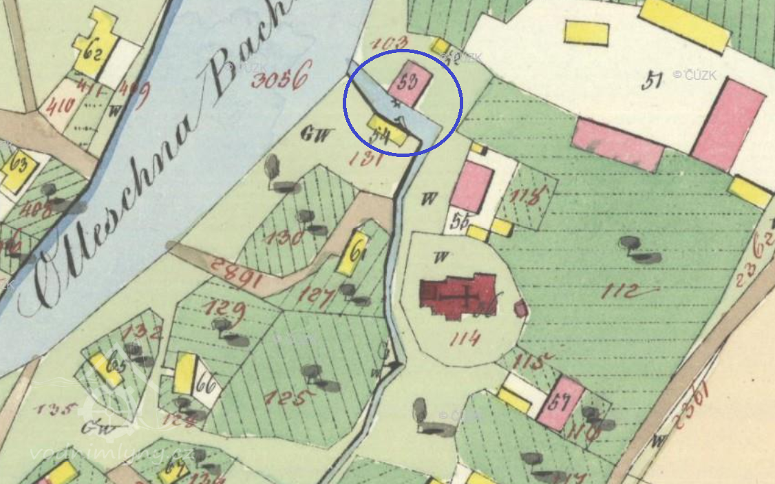 V roce 1833 máme zachycenou situaci budovy zděného mlýna s číslem 53 na pravém břehu náhonu, s mlýnským kolem a dřevěným objektem pily s číslem 54 na opačném břehu.