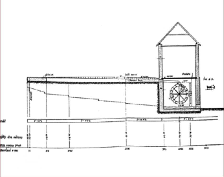 PopisJedno vodní kolo o průměru 2,20 m a šířce 60 cm umístěné v prostoru pod podlahou dílny.